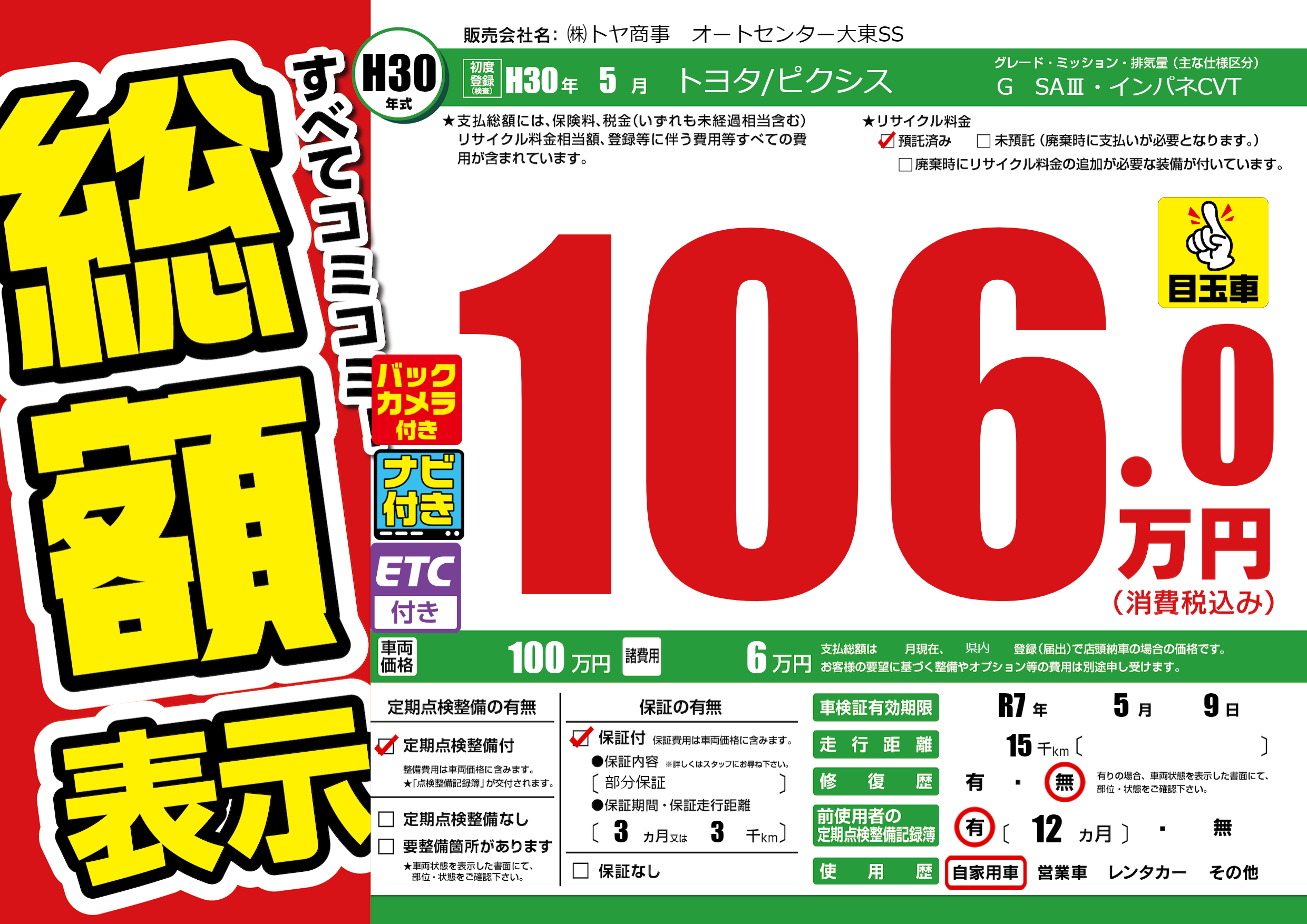 | 車名 | トヨタ/ピクシス | グレード ミッション 排気量 |