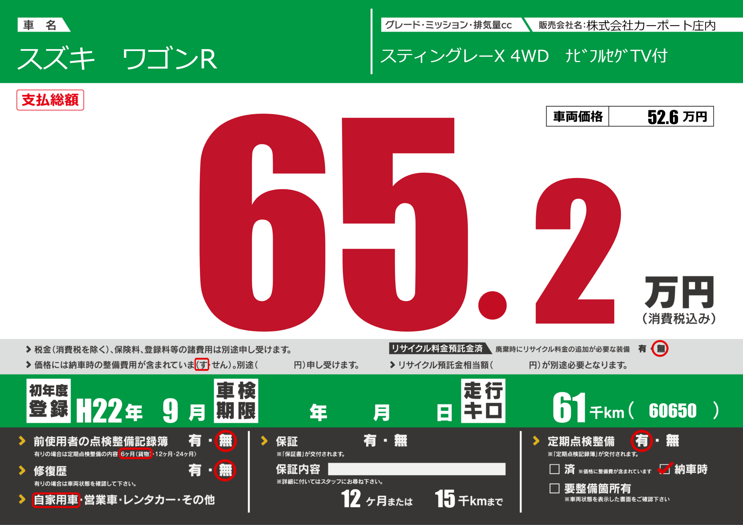 | 定期点検整備 | 定期点検整備あり 納車時あり | ||