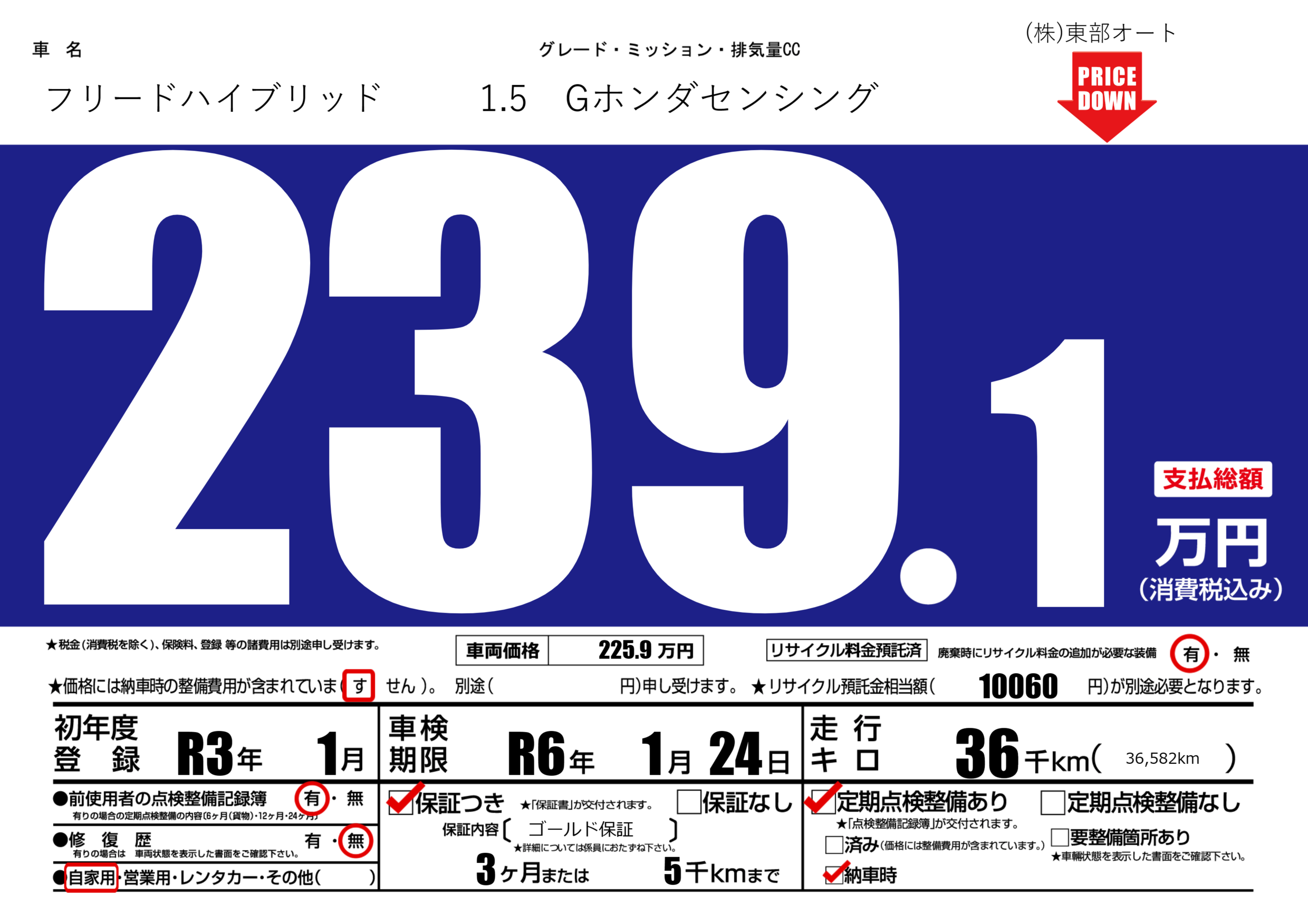 | 車名 | フリードハイブリッド | グレード ミッション 排気量 |
