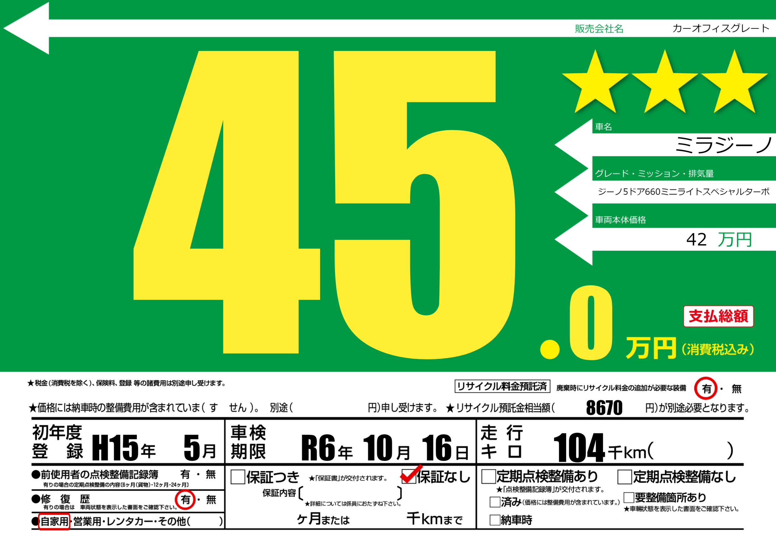 | 走行キロ | 10.4万km | 初年度登録 | H15年5月 |