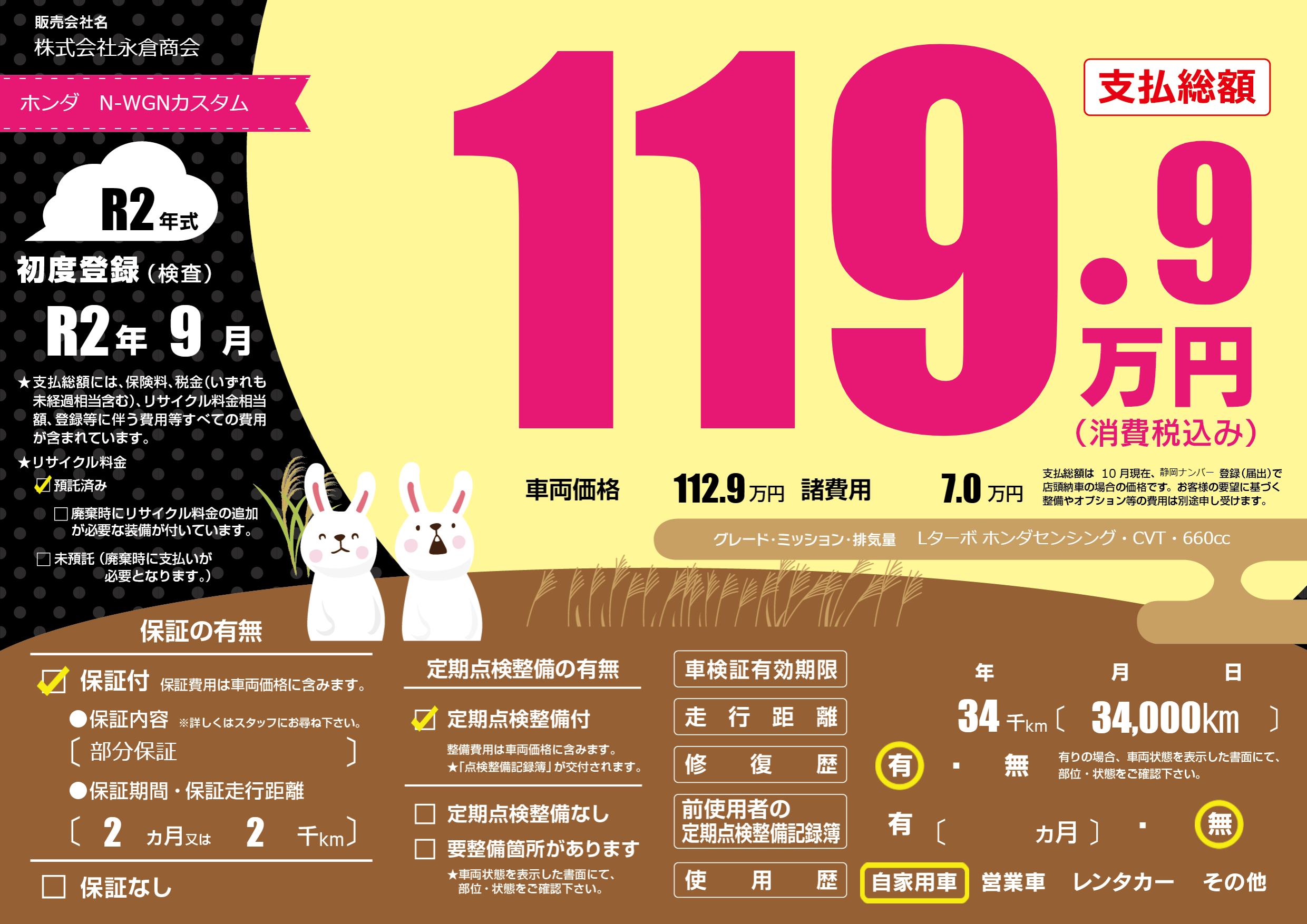 | 走行キロ | 3.4万km | 初年度登録 | R2年9月 |