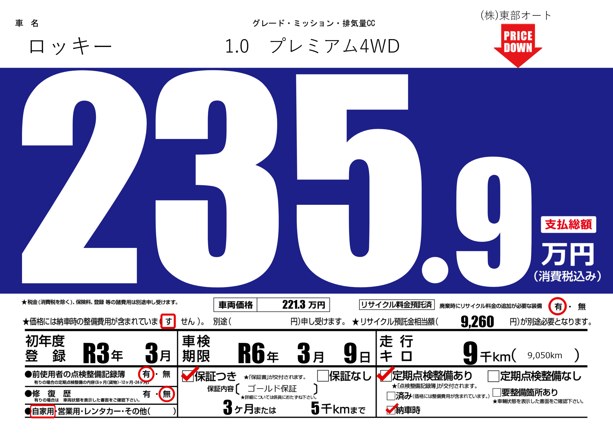 | 走行キロ | 0.9万km | 初年度登録 | R3年3月 |