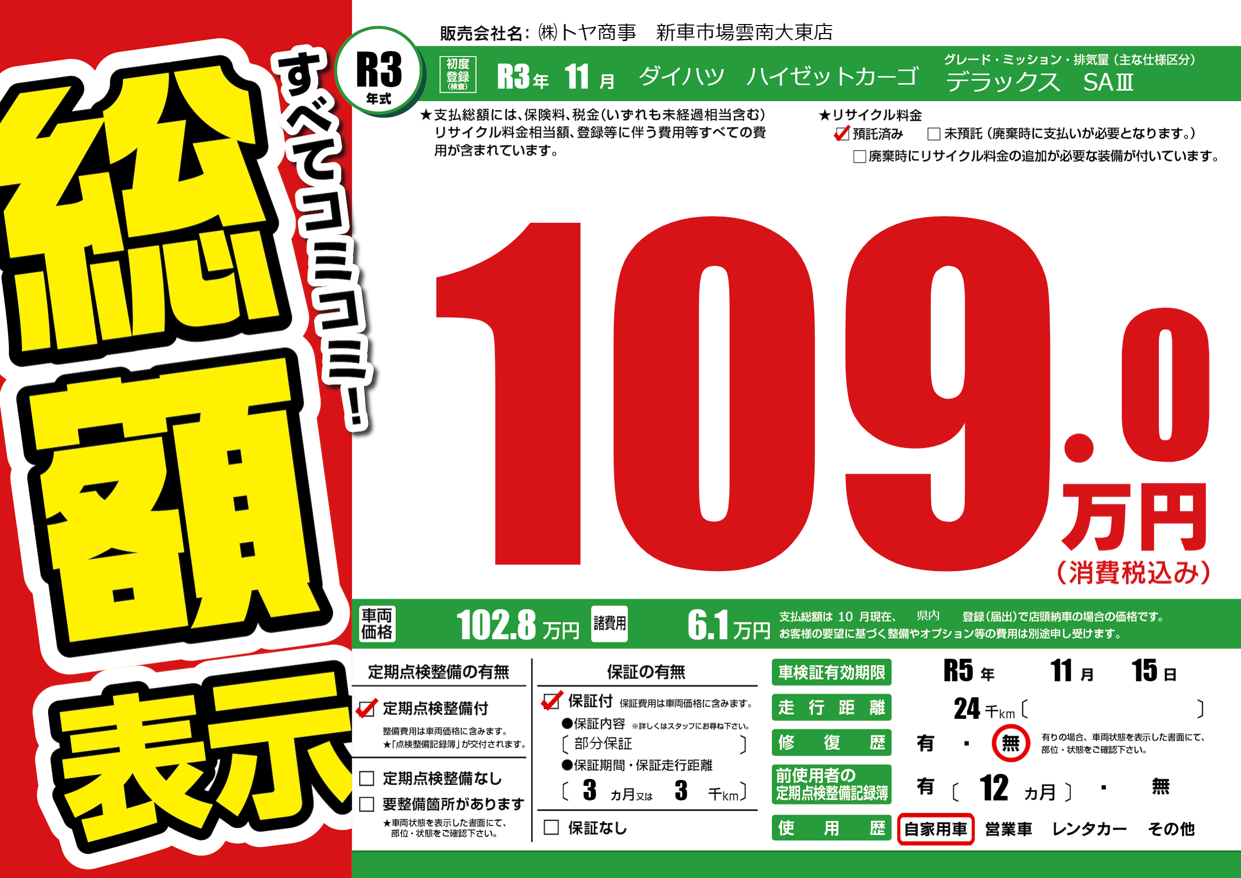 | 車名 | ダイハツ ハイゼットカーゴ | グレード ミッション 排気量 |