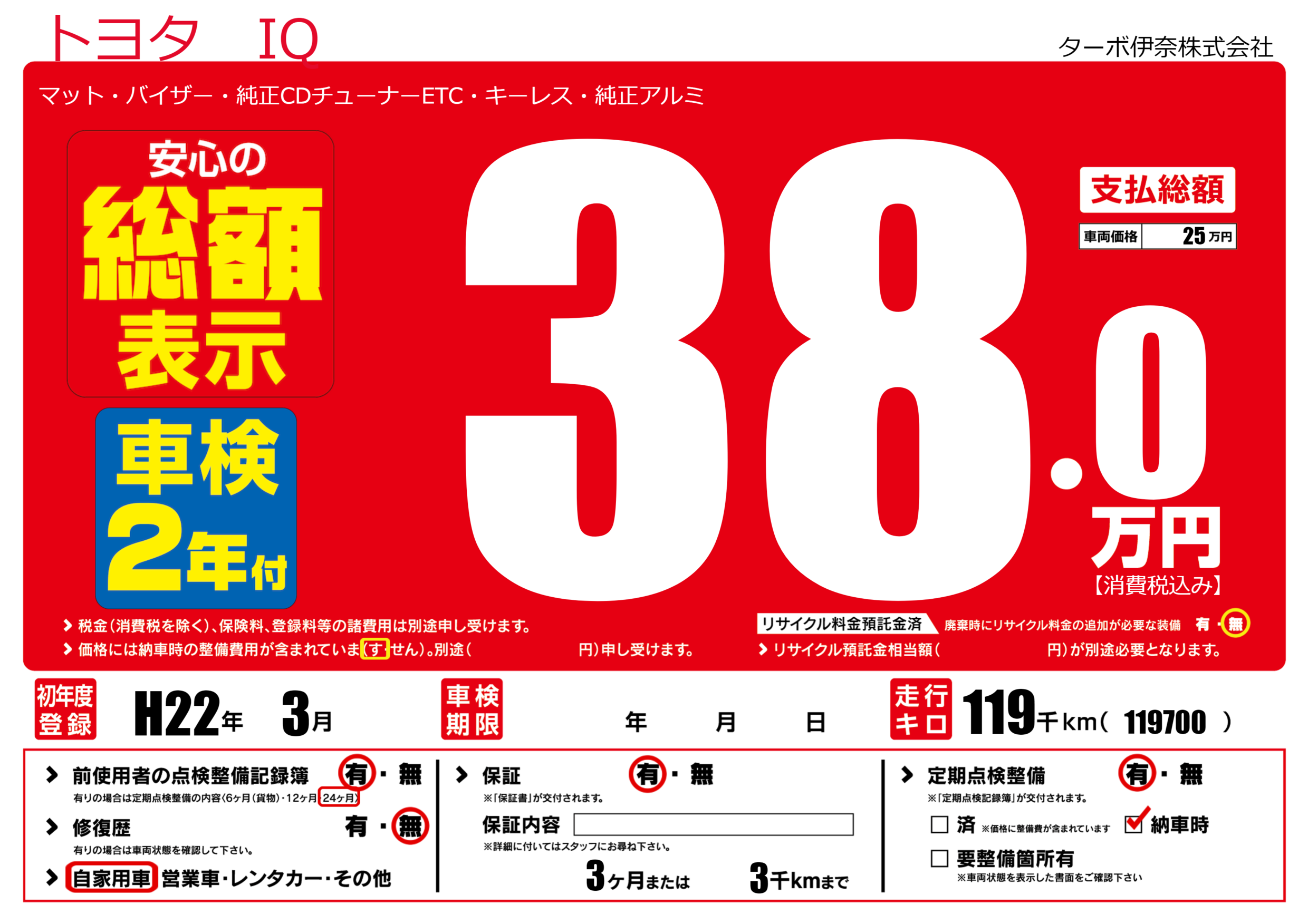 | 車名 | トヨタ IQ | グレード ミッション 排気量 |