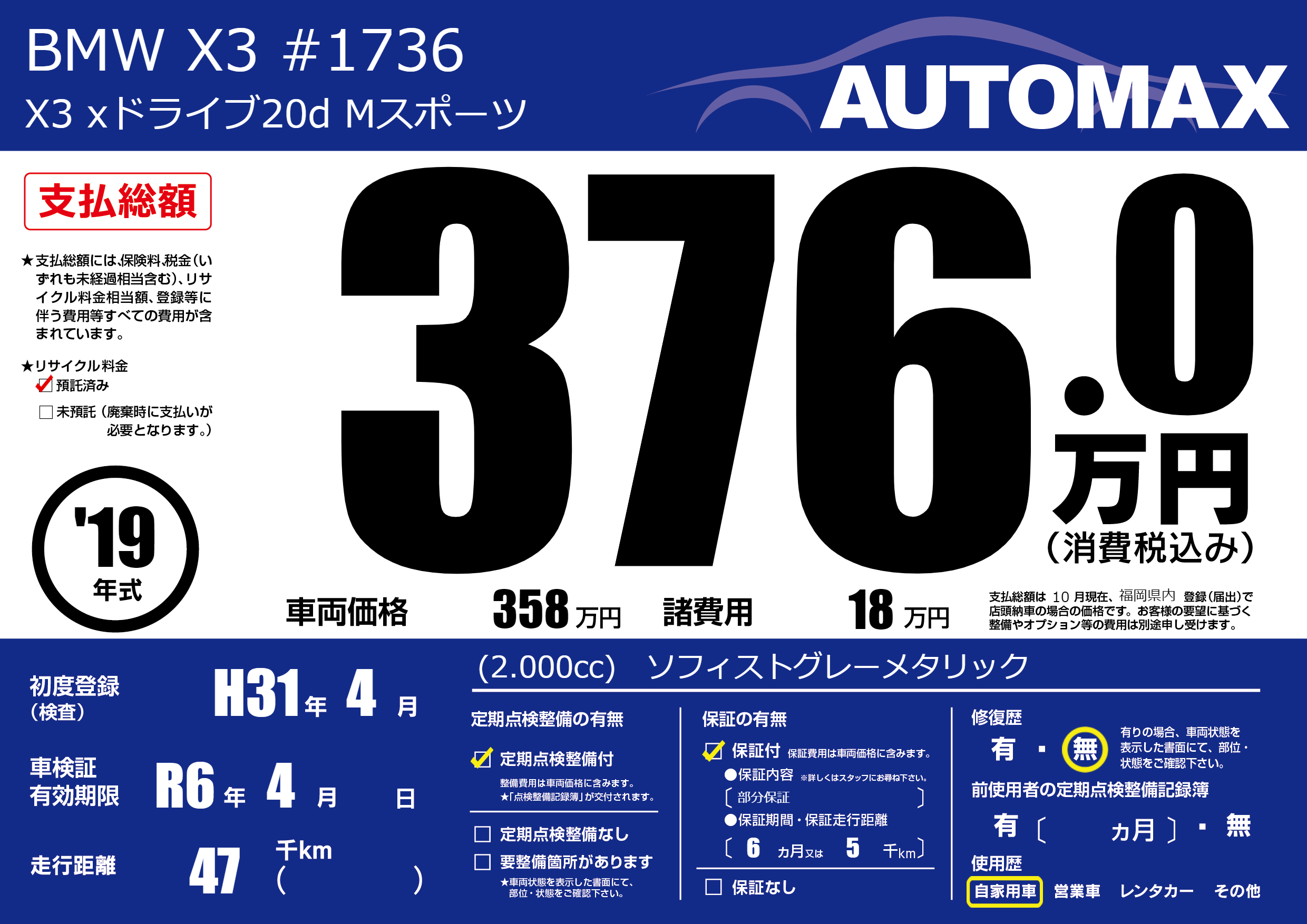 | 車名 | BMW X3 #1736 | グレード ミッション 排気量 |