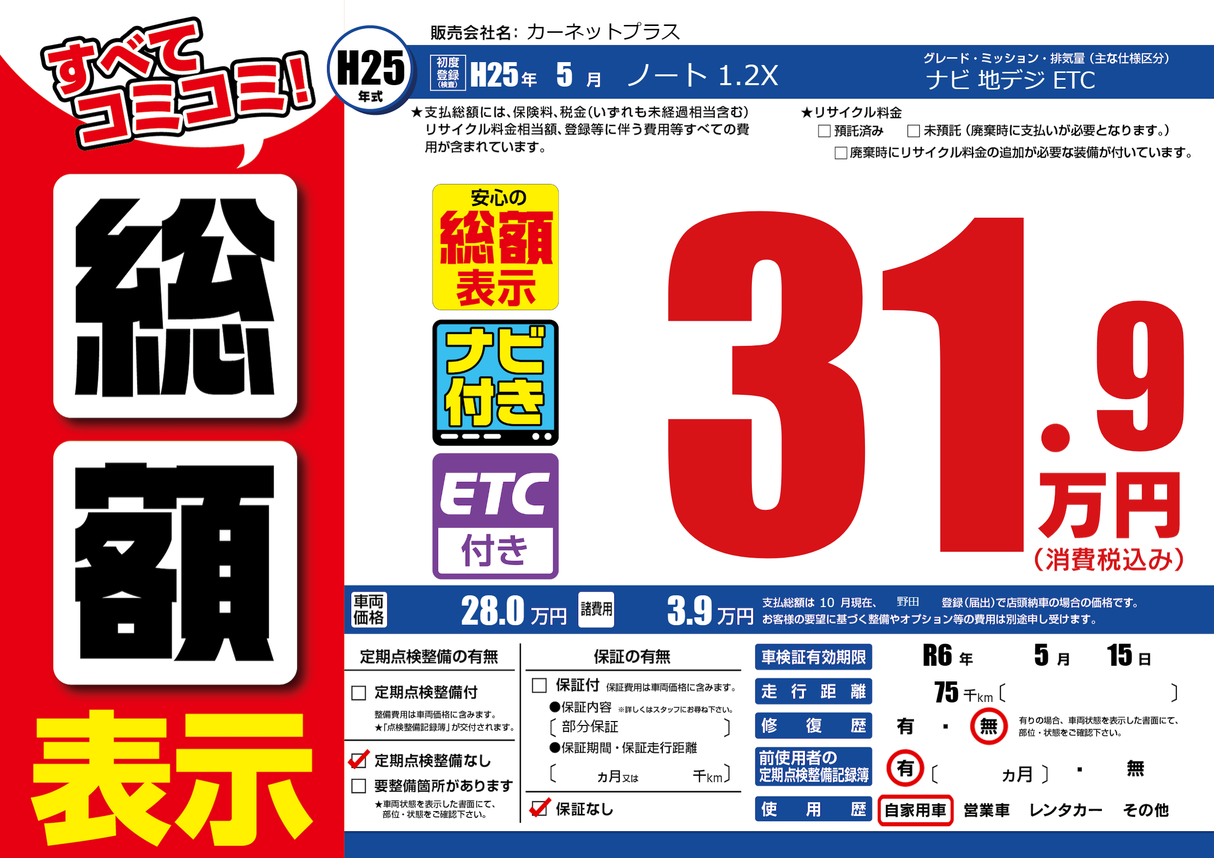 | 車名 | ノート 1.2X | グレード ミッション 排気量 |