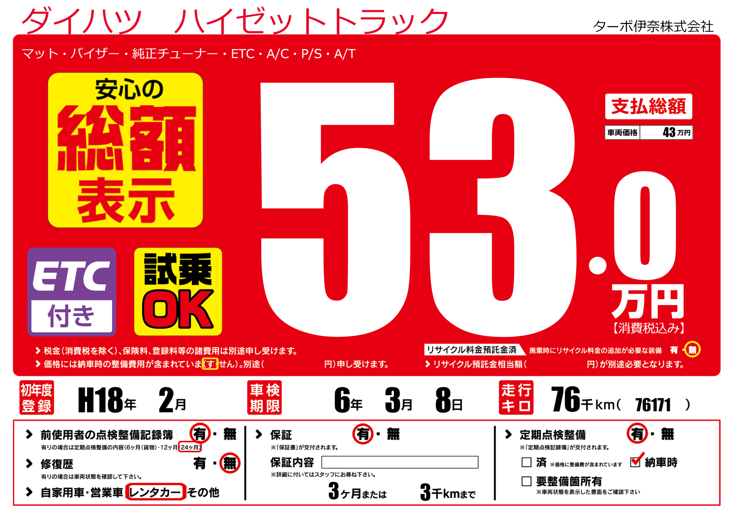 保証なし 保証内容(---) 3ヶ月または(3)千kmまで |