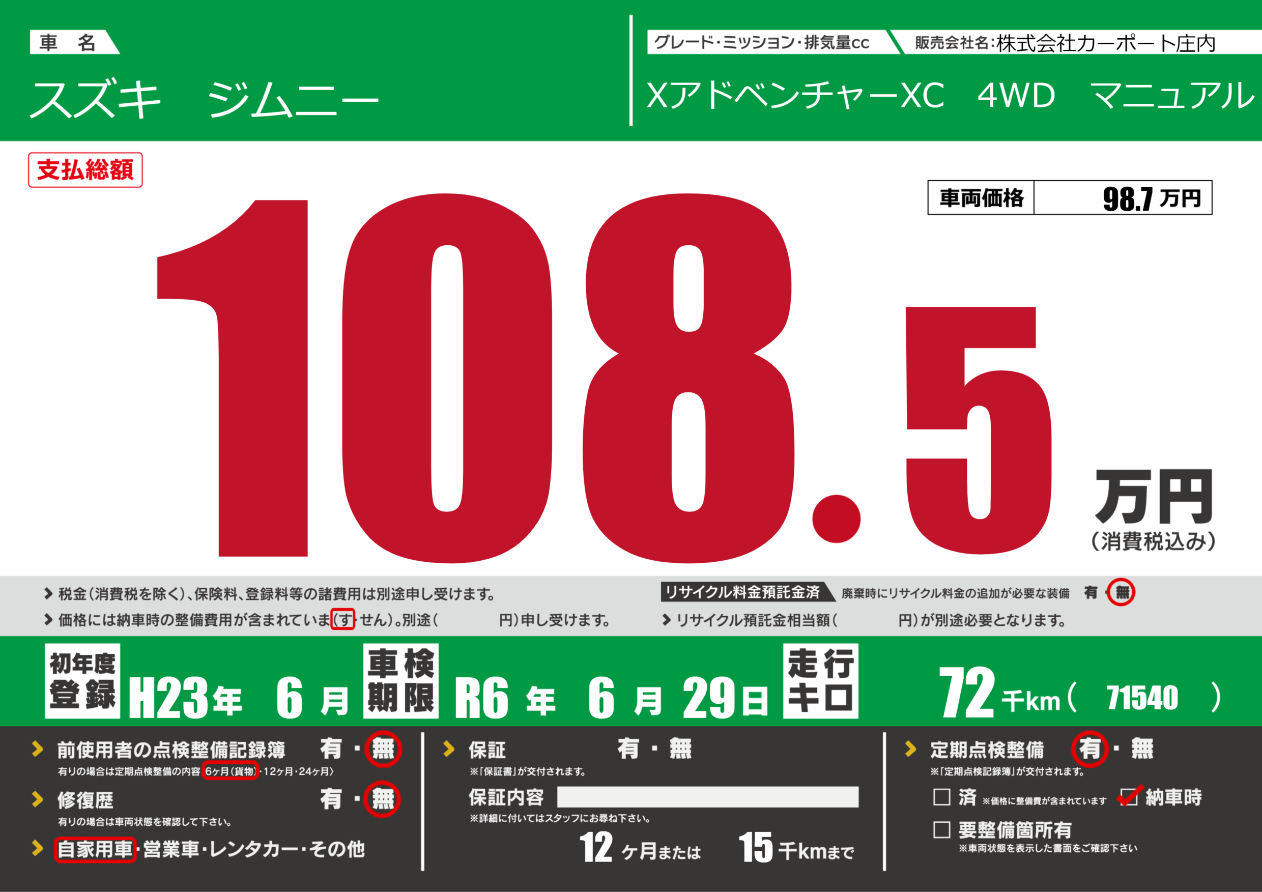 | 車名 | スズキ ジムニー | グレード ミッション 排気量 |