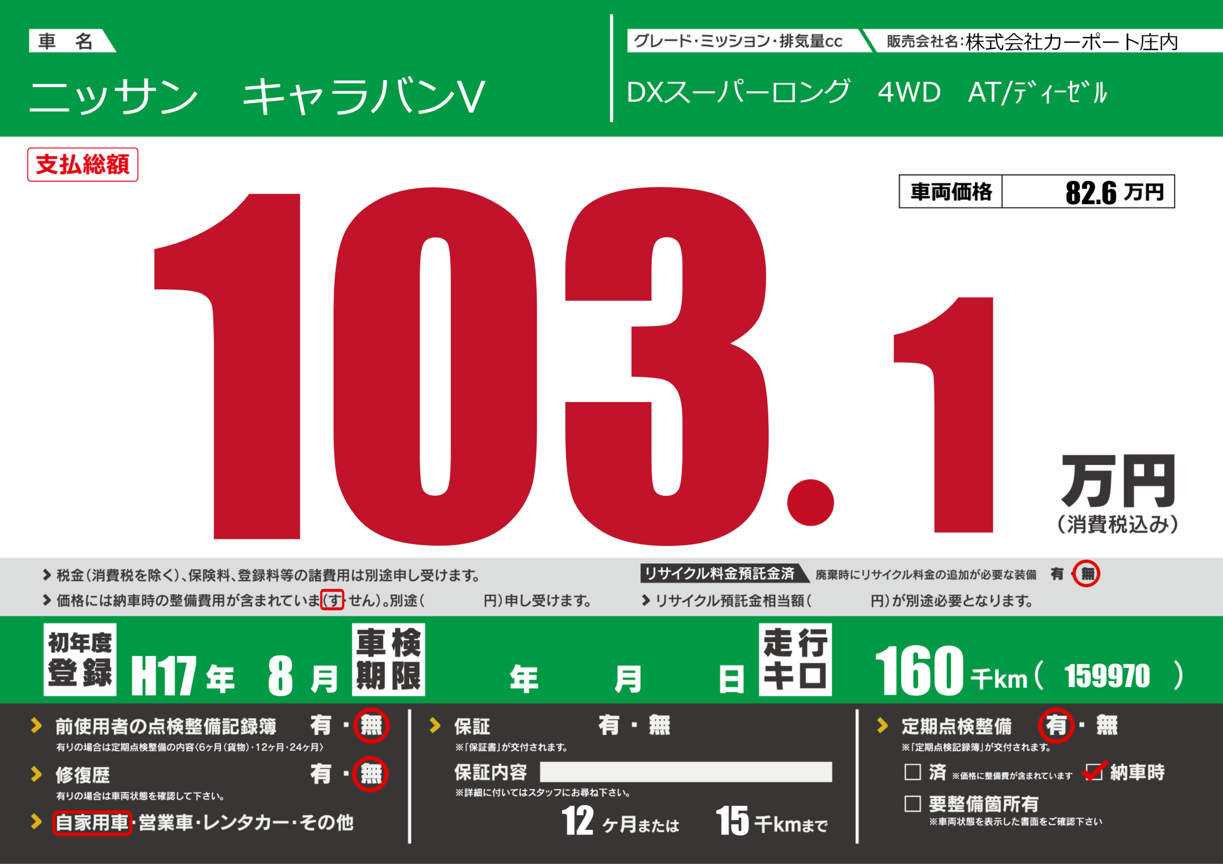 | 車名 | ニッサン キャラバンV | グレード ミッション 排気量 |