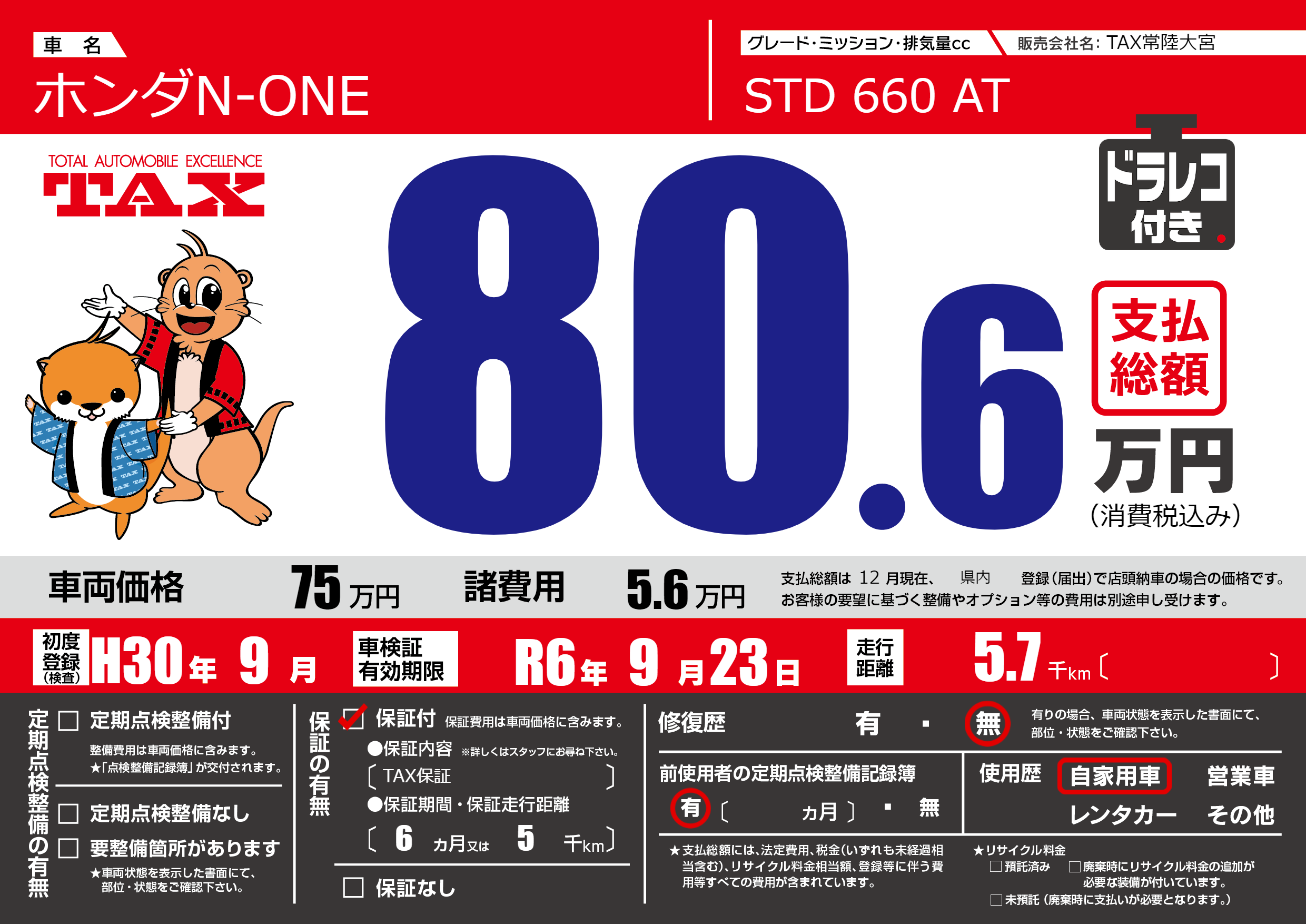 保証付き 保証内容(TAX保証) 6ヶ月または(5)千kmまで |