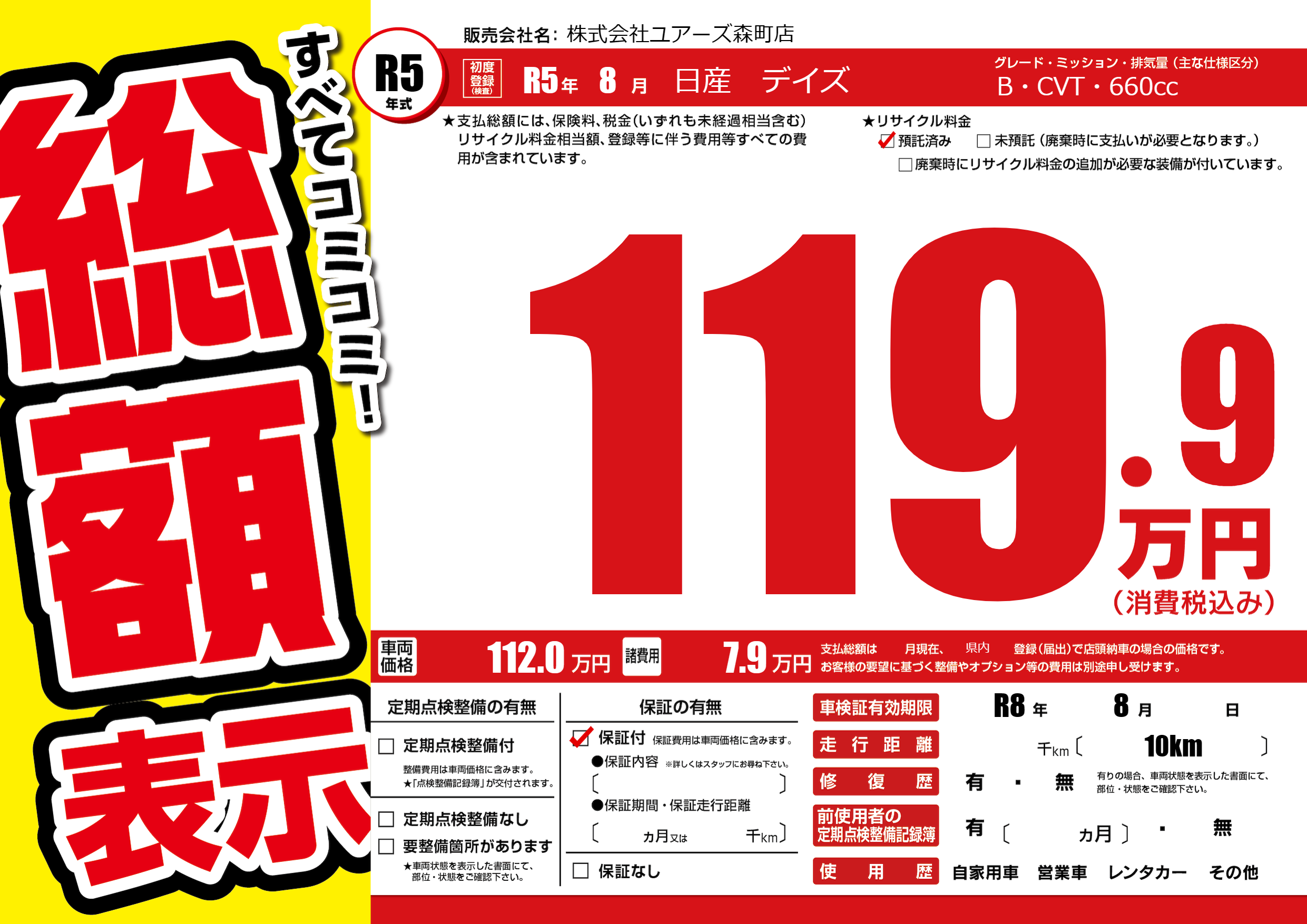 | 車名 | 日産 デイズ | グレード ミッション 排気量 |