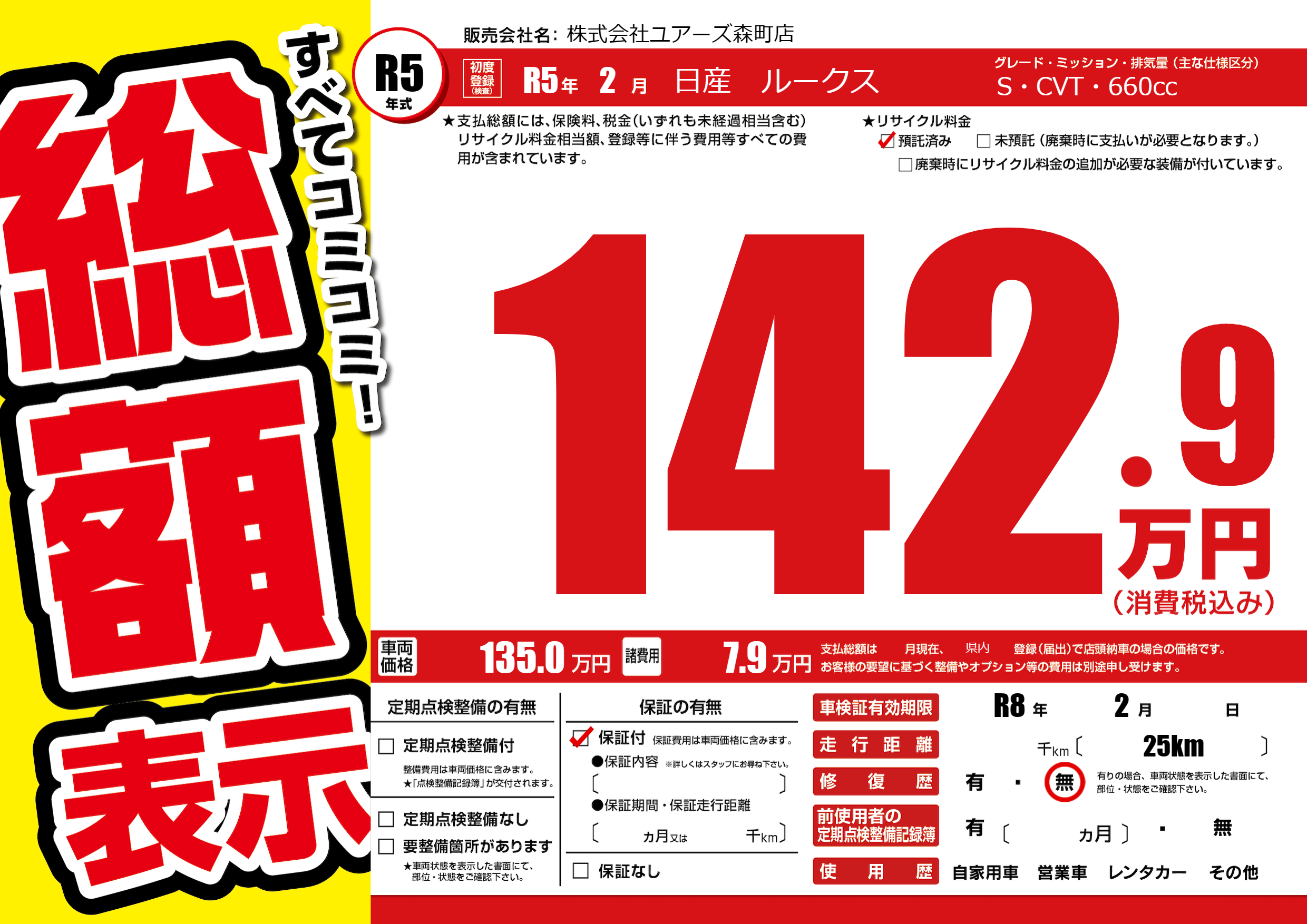 | 走行キロ | - | 初年度登録 | R5年2月 |
