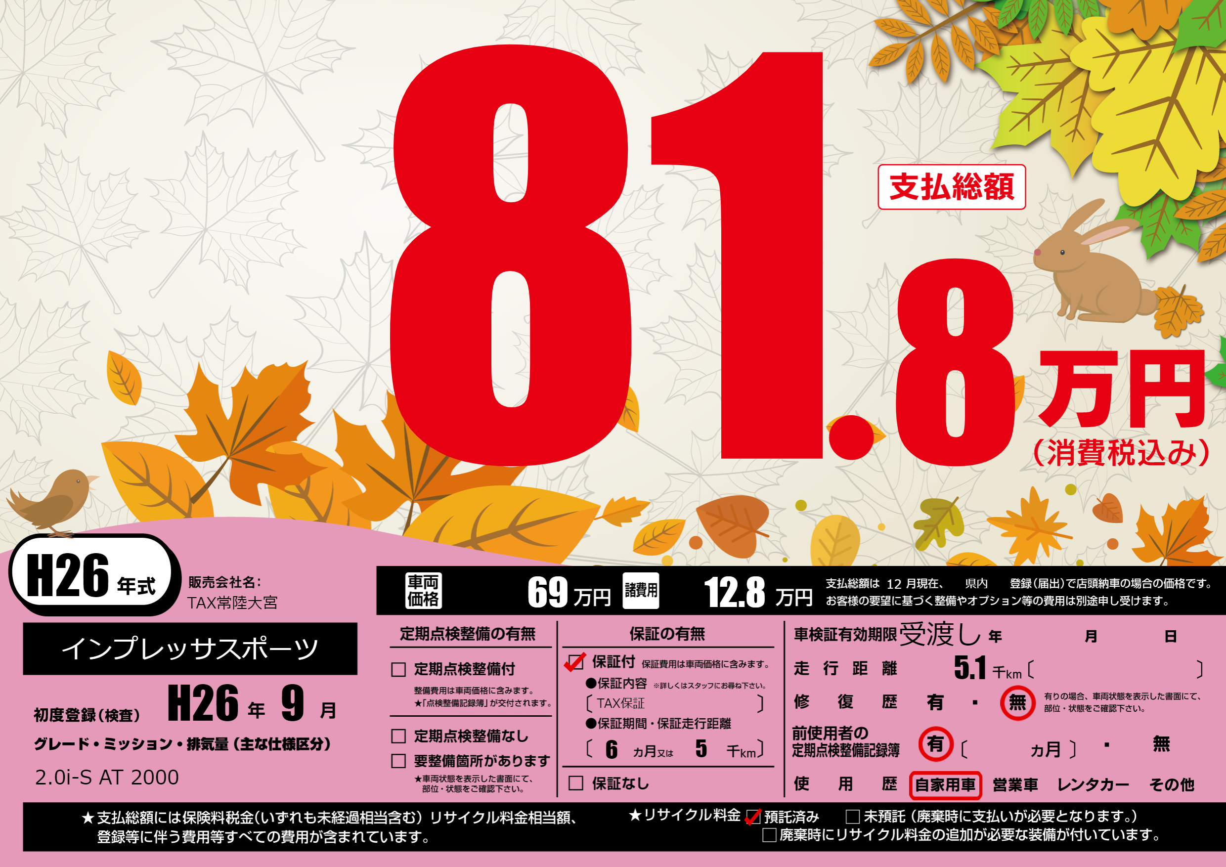 | 車名 | インプレッサスポーツ | グレード ミッション 排気量 |