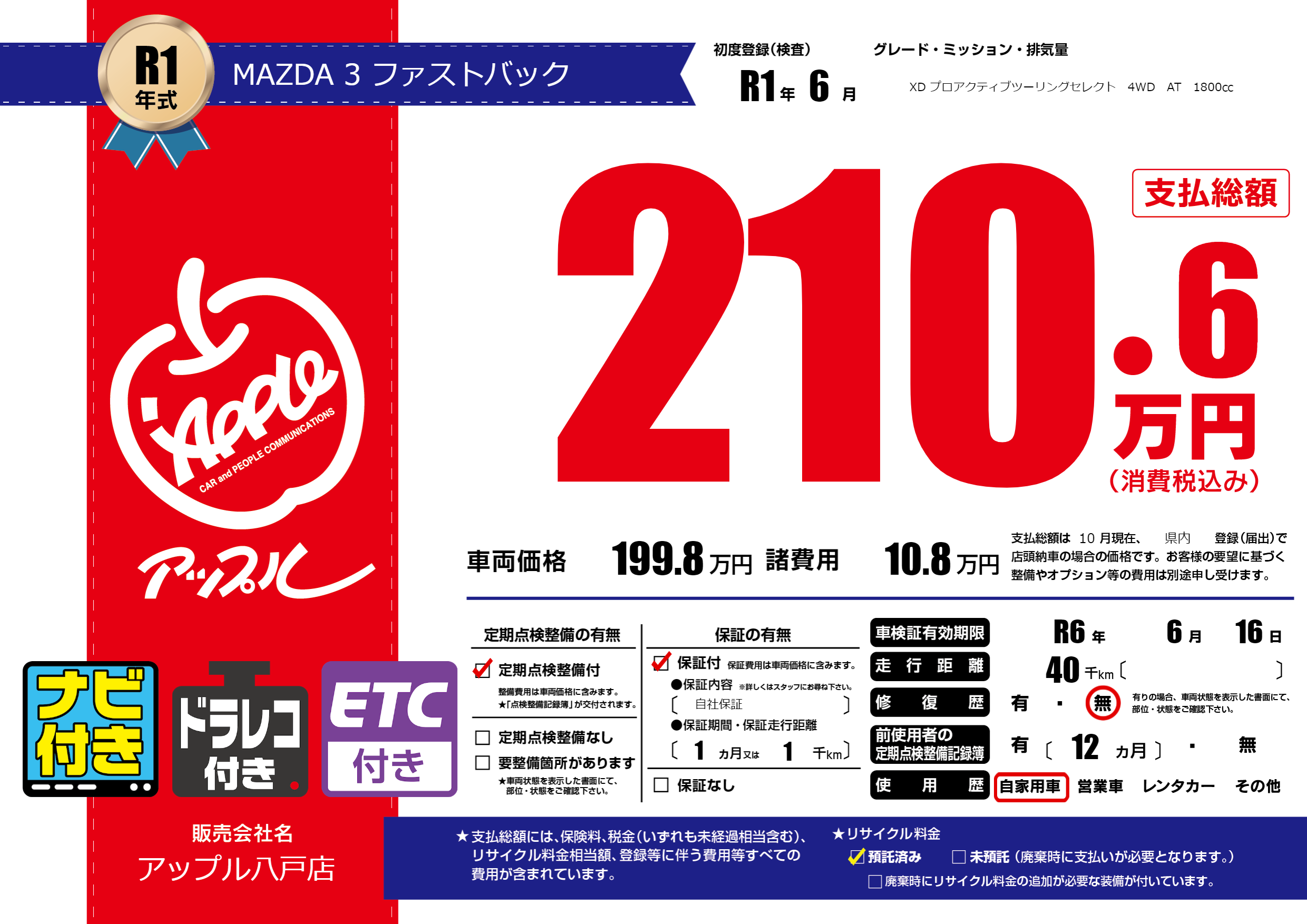 | 車名 | MAZDA 3 ファストバック | グレード ミッション 排気量 |