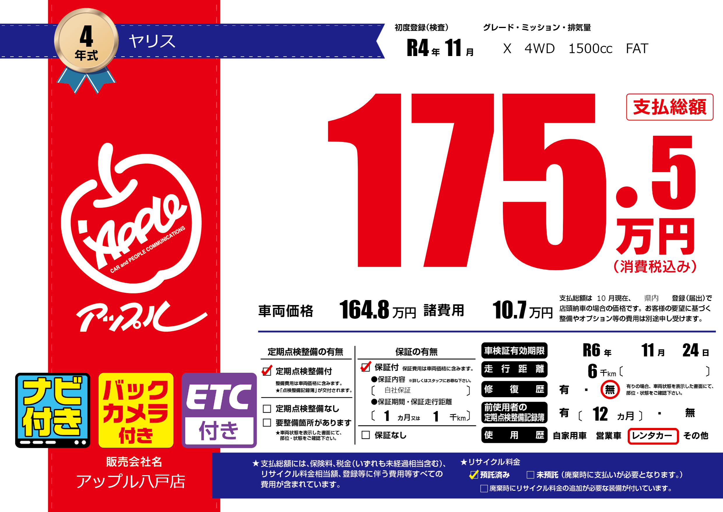 | 走行キロ | 0.6万km | 初年度登録 | R4年11月 |