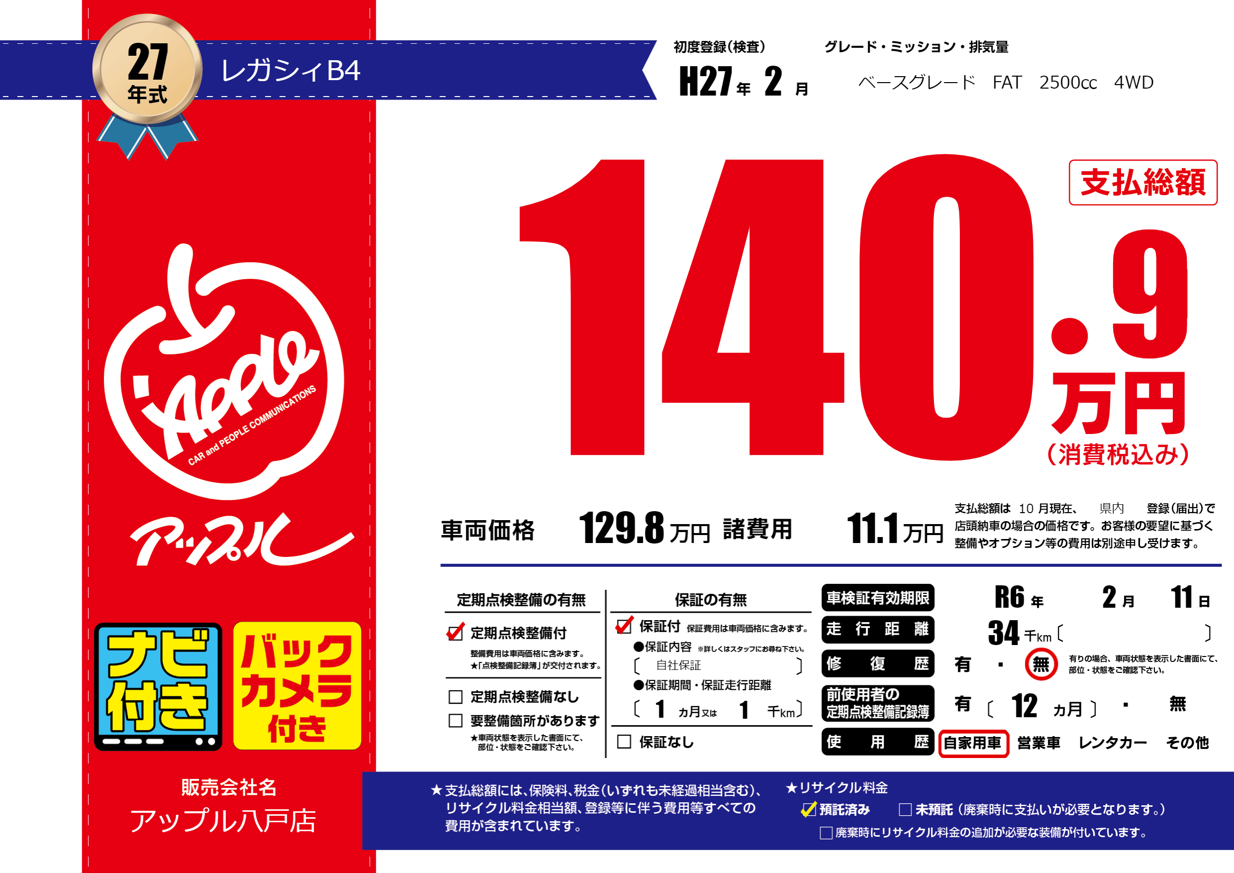 | 車名 | レガシィB4 | グレード ミッション 排気量 |