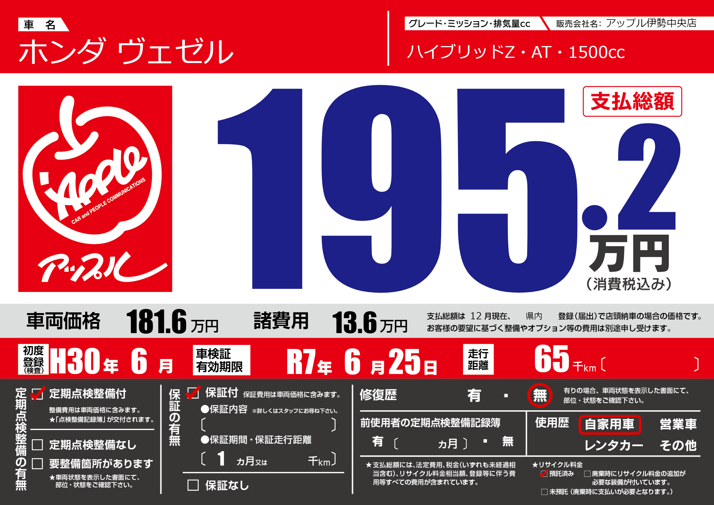 なし | 車検制限 | R7年6月25月 |
