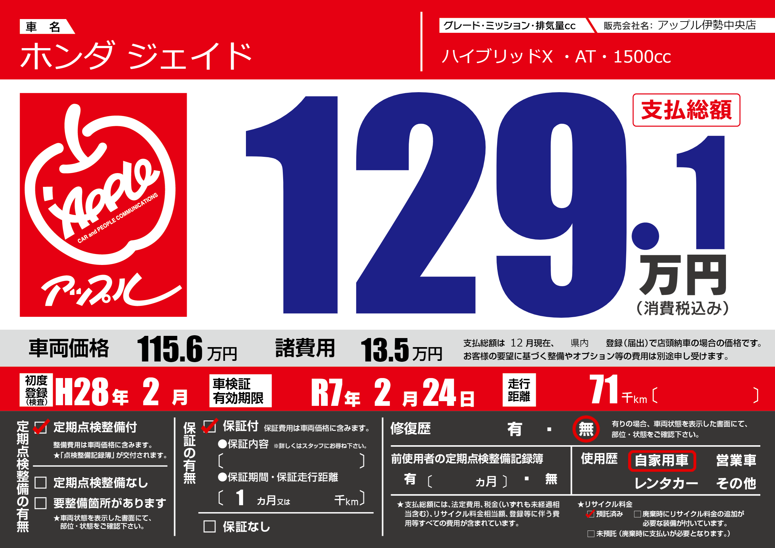 | 車名 | ホンダ ジェイド | グレード ミッション 排気量 |