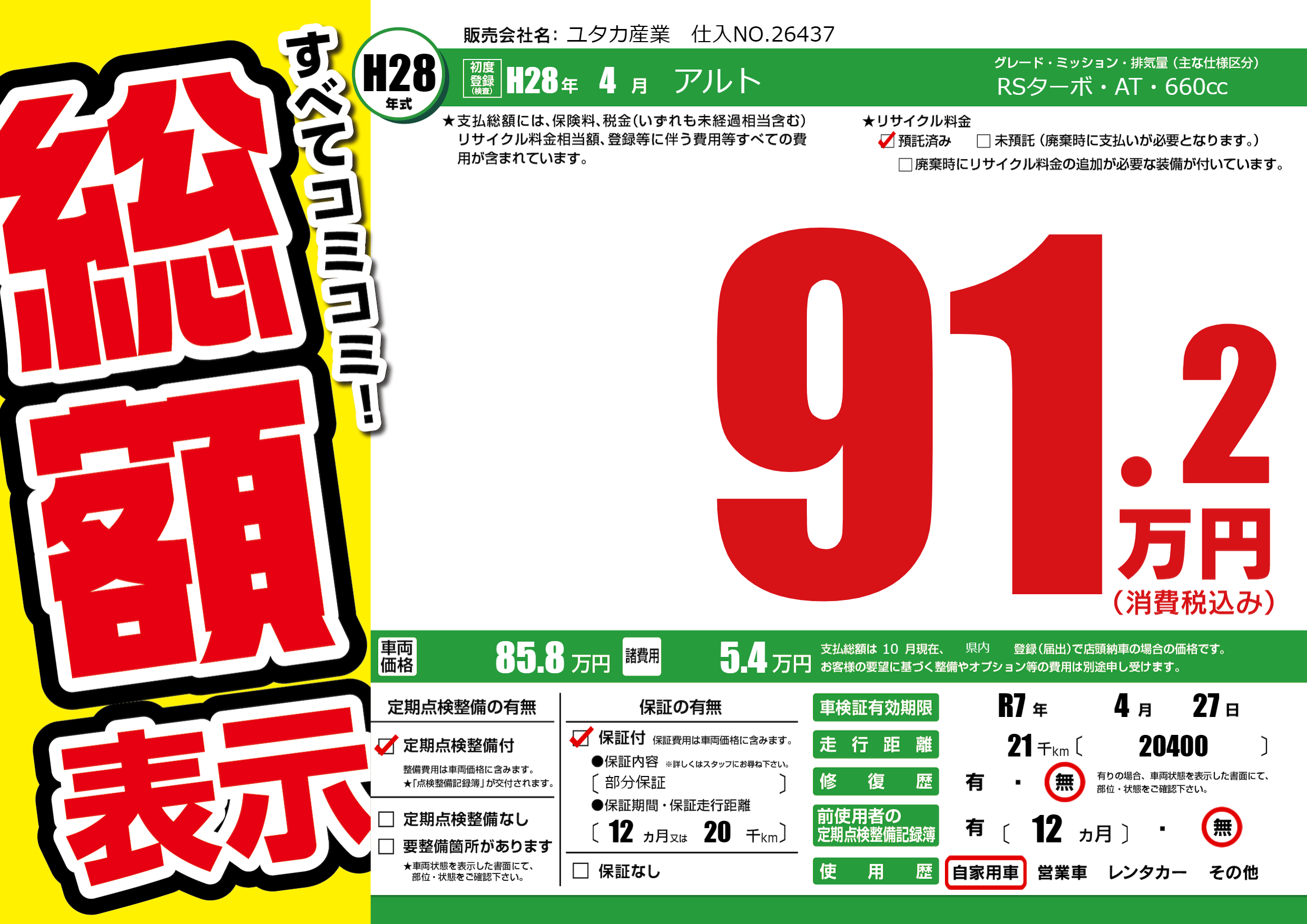 保証付き 保証内容(部分保証) 12ヶ月または(20)千kmまで |