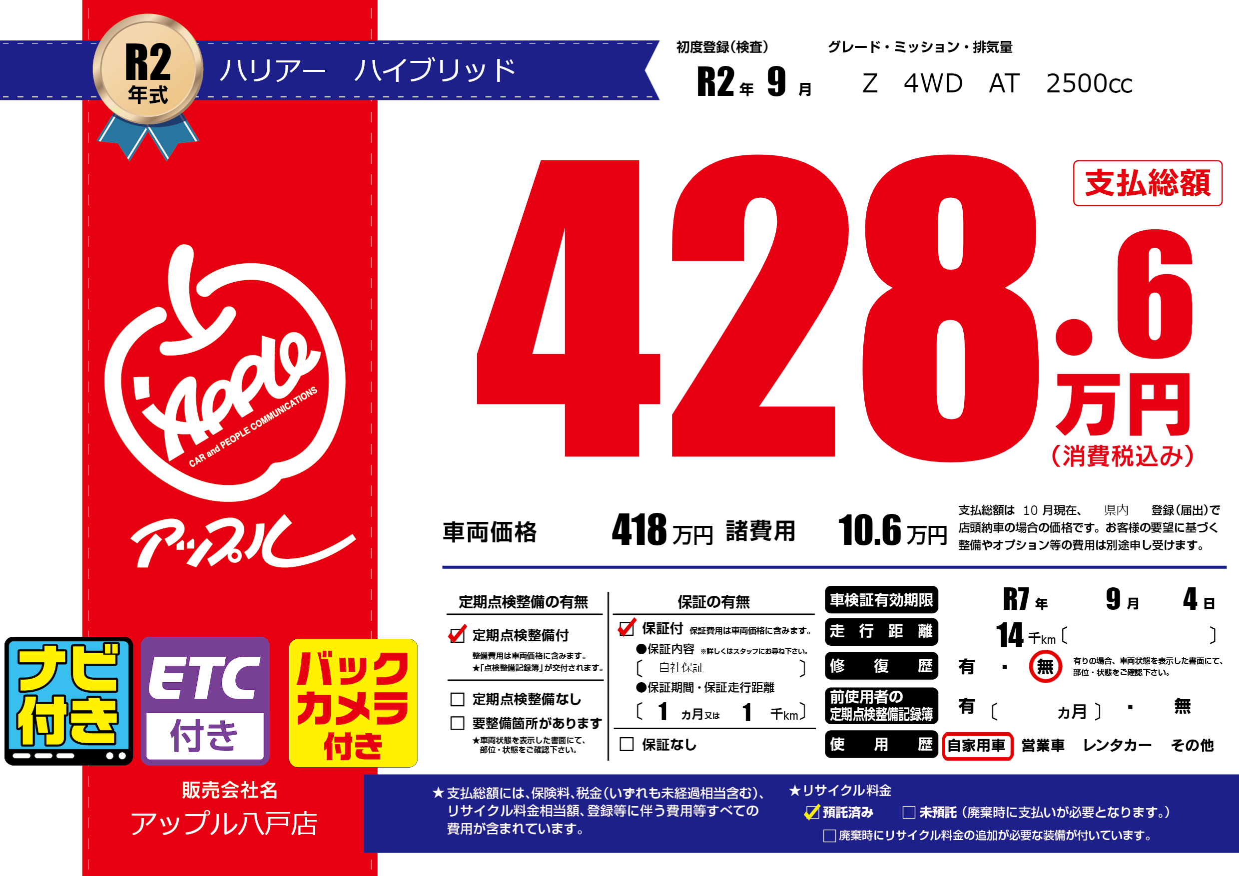 | 走行キロ | 1.4万km | 初年度登録 | R2年9月 |