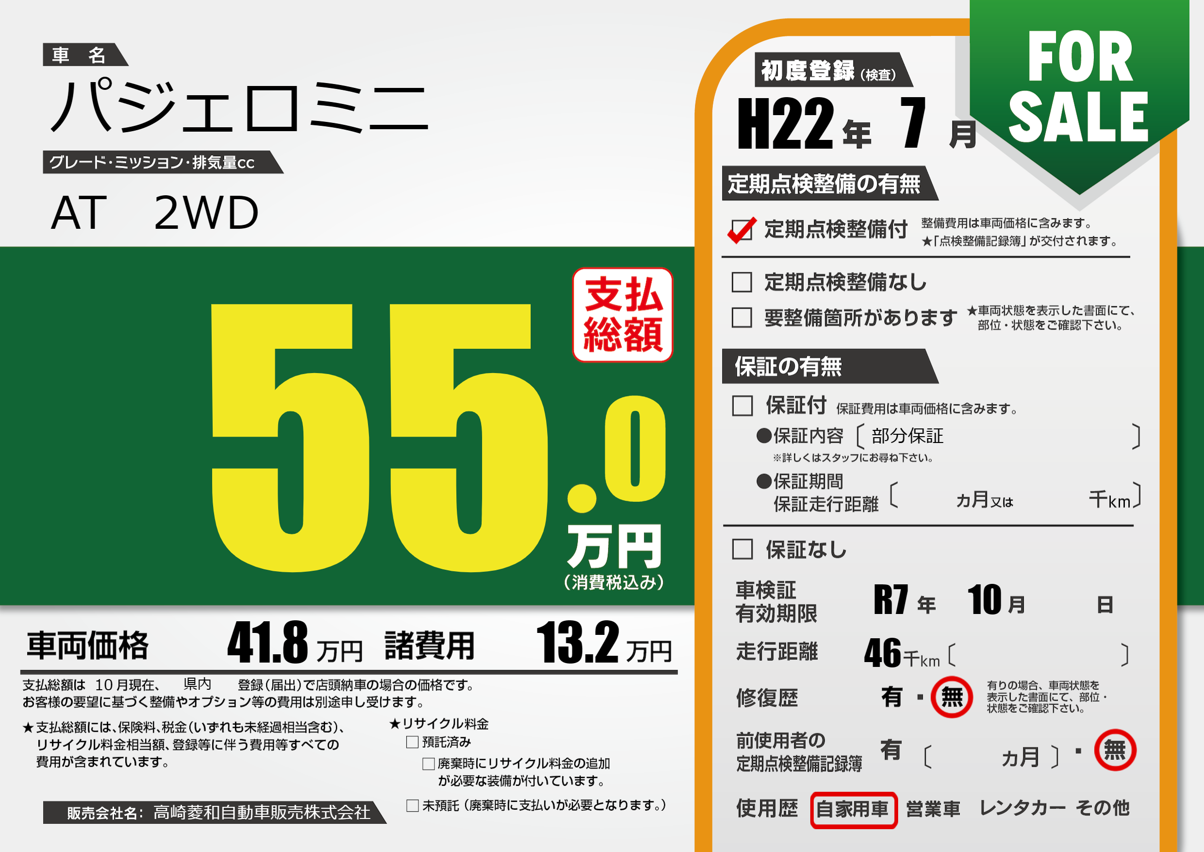 | 車名 | パジェロミニ | グレード ミッション 排気量 |