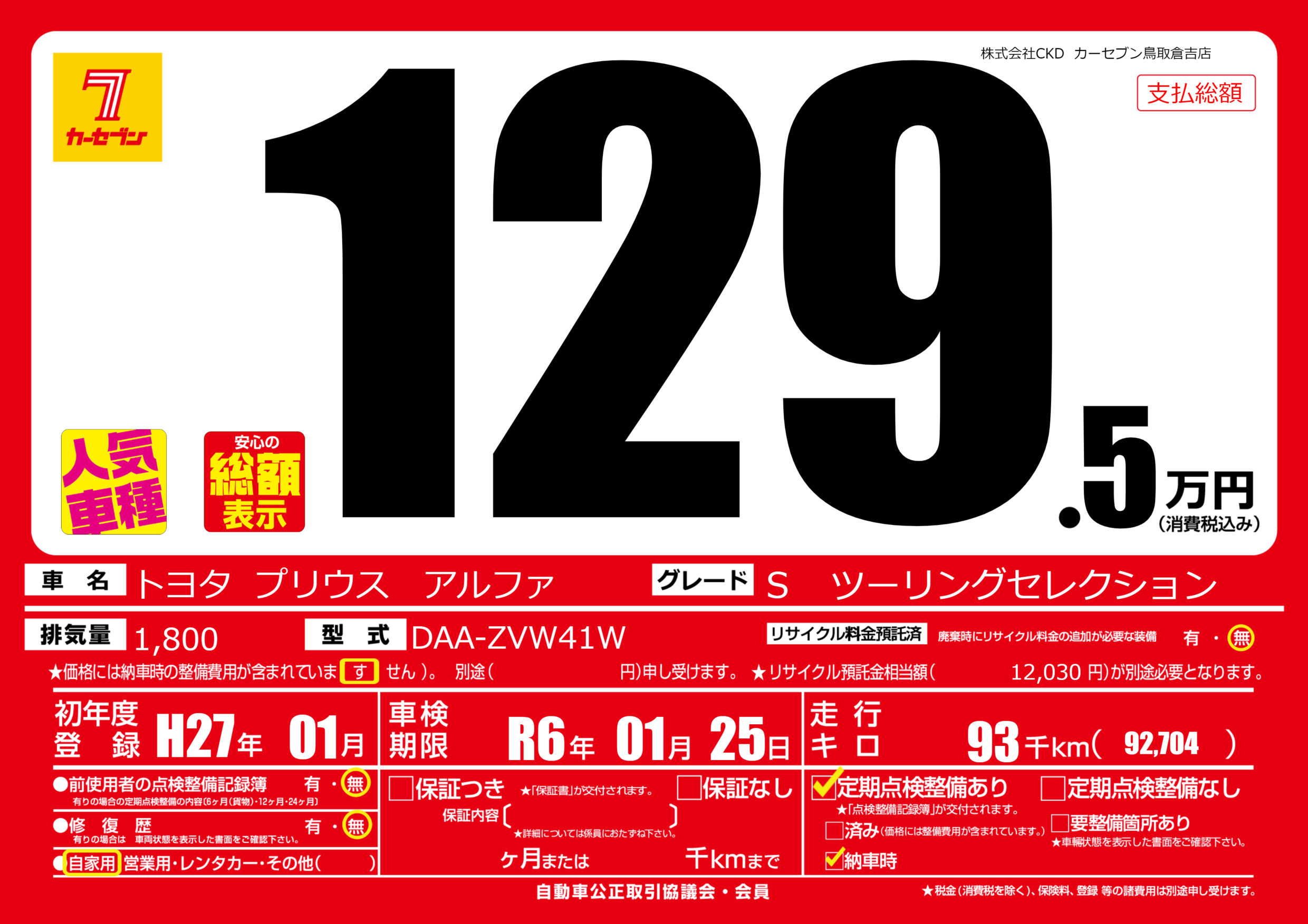 | 車名 | トヨタ プリウス アルファ | グレード ミッション 排気量 |