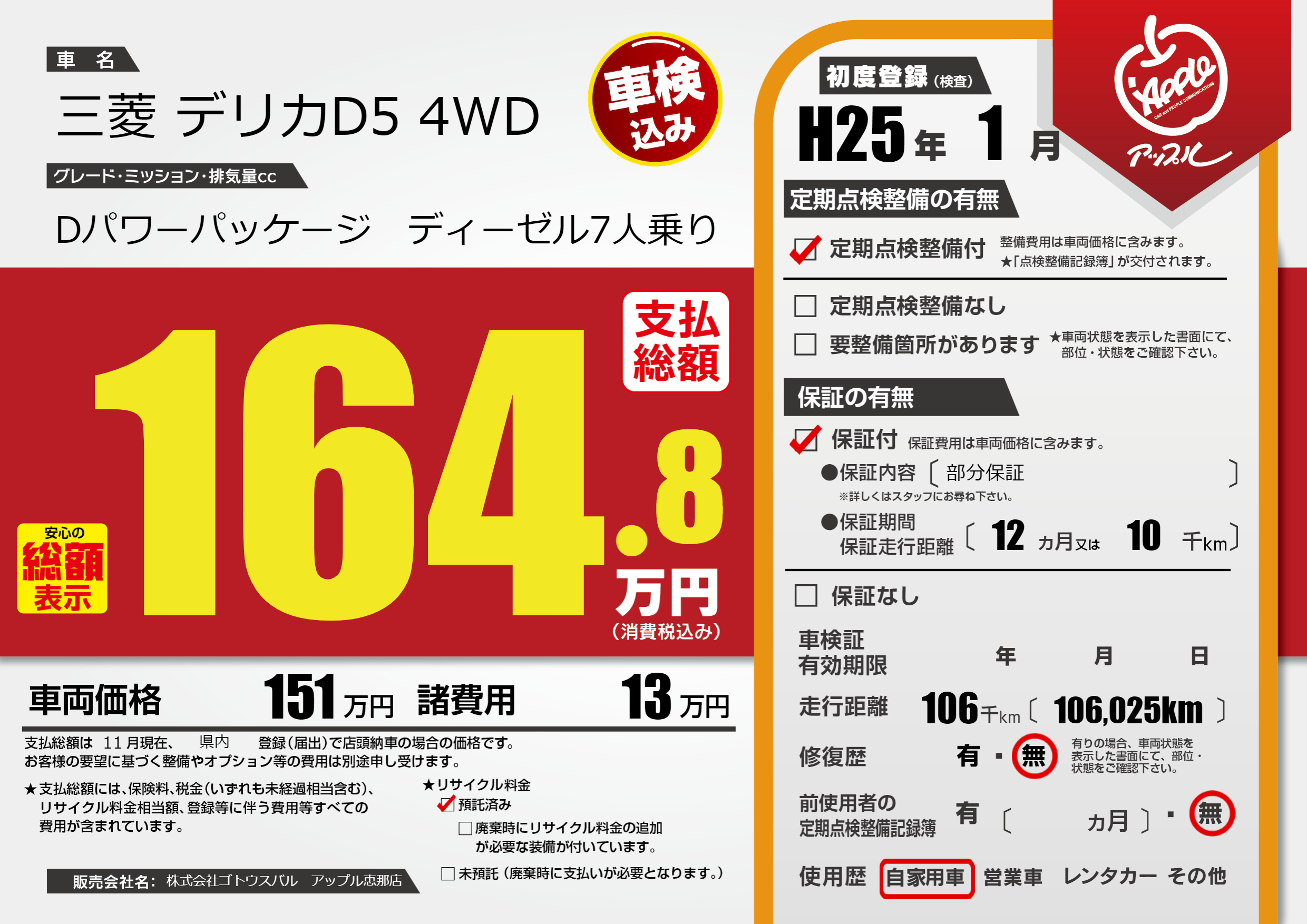保証付き 保証内容(部分保証) 12ヶ月または(10)千kmまで |