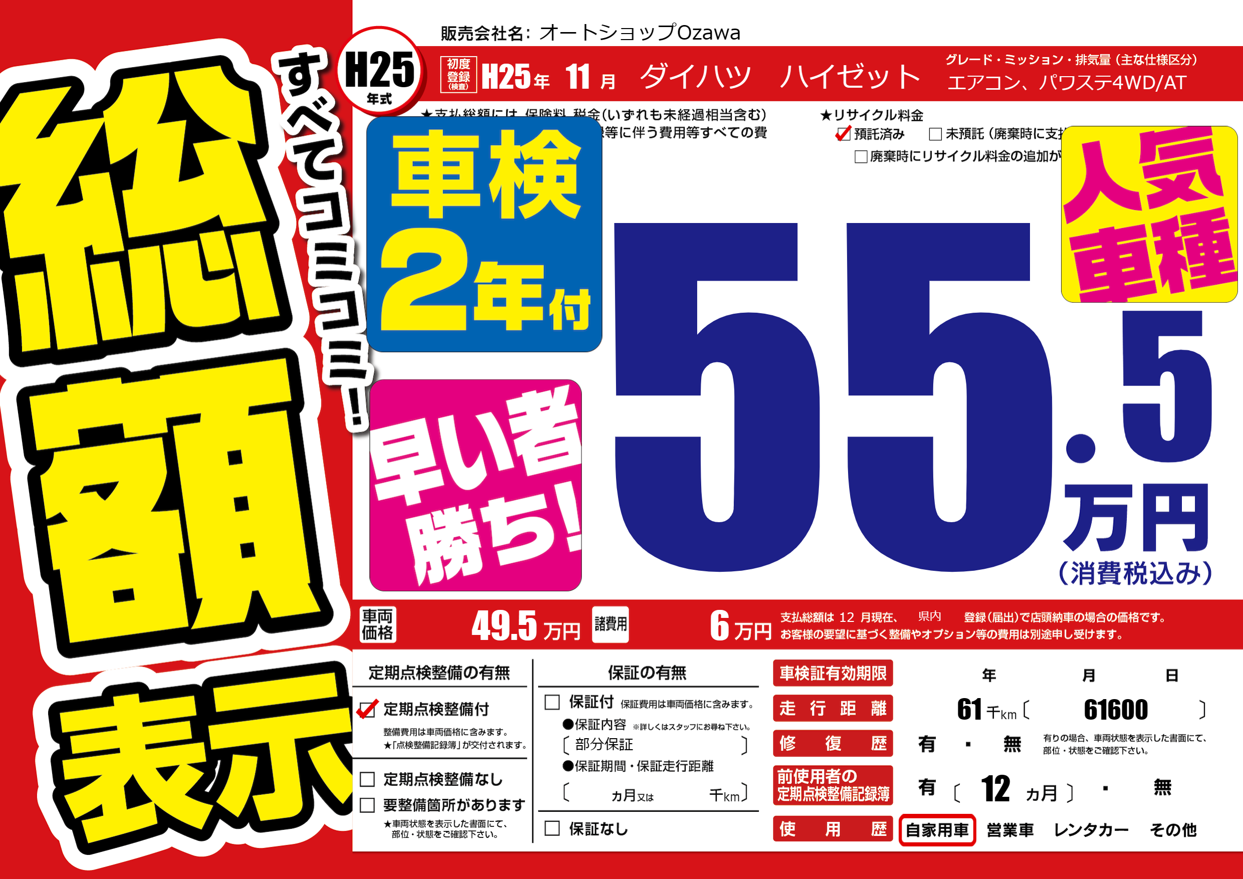 | 走行キロ | 6.1万km | 初年度登録 | H25年11月 |