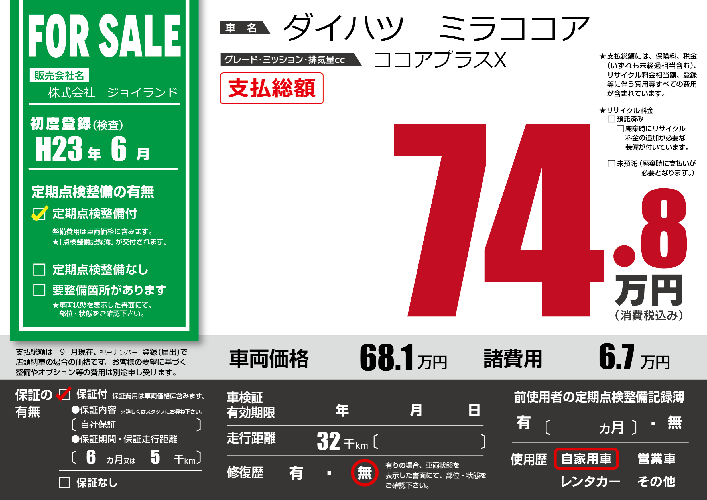 | 走行キロ | 3.2万km | 初年度登録 | H23年6月 |