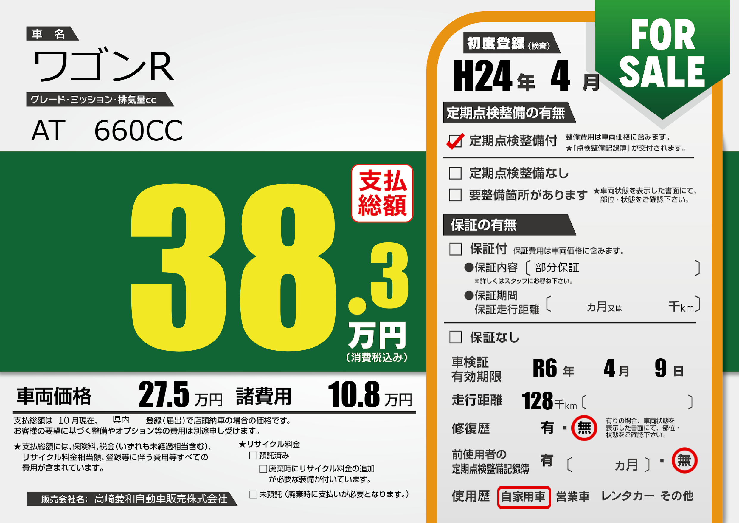 | 車名 | ワゴンR | グレード ミッション 排気量 |