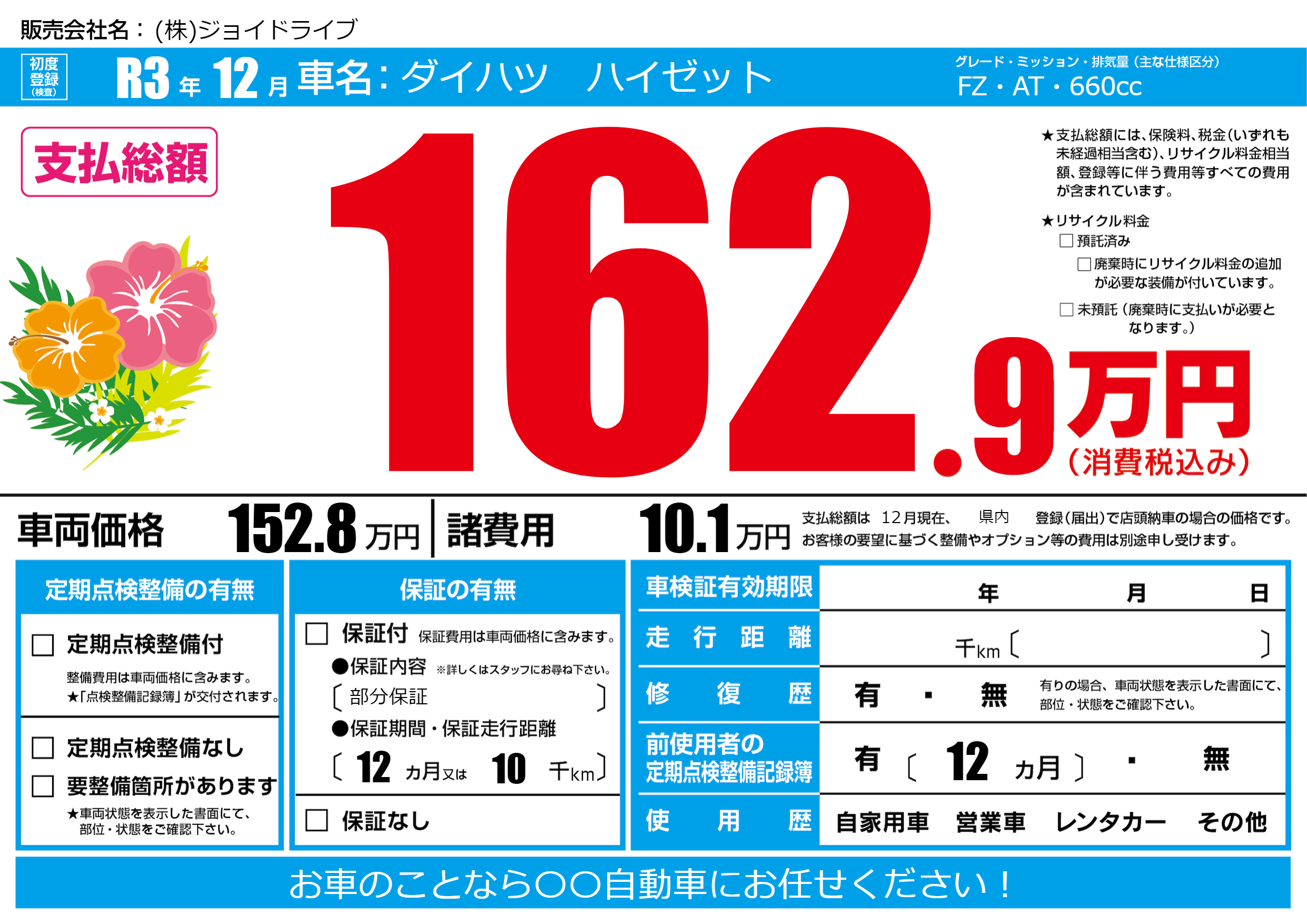 保証なし 保証内容(部分保証) 12ヶ月または(10)千kmまで |