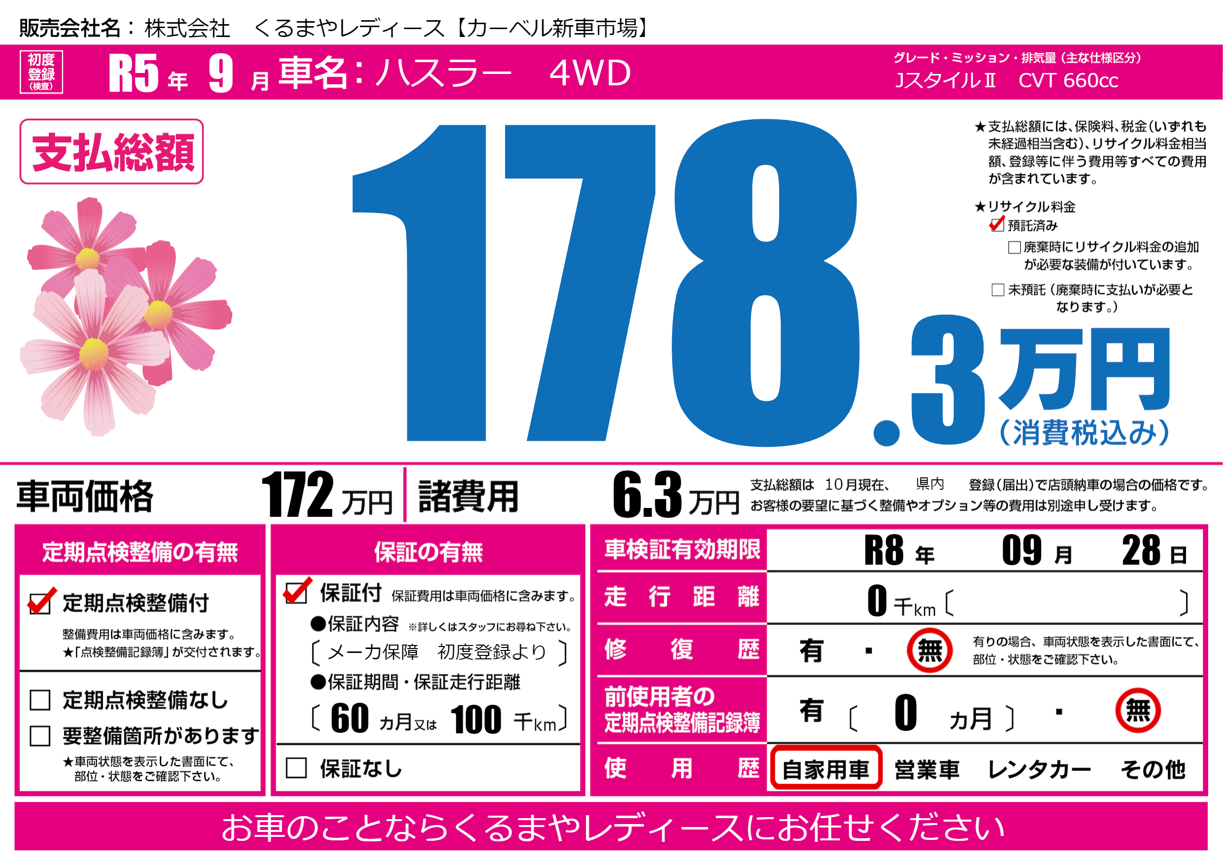 | 車名 | ハスラー 4WD | グレード ミッション 排気量 |