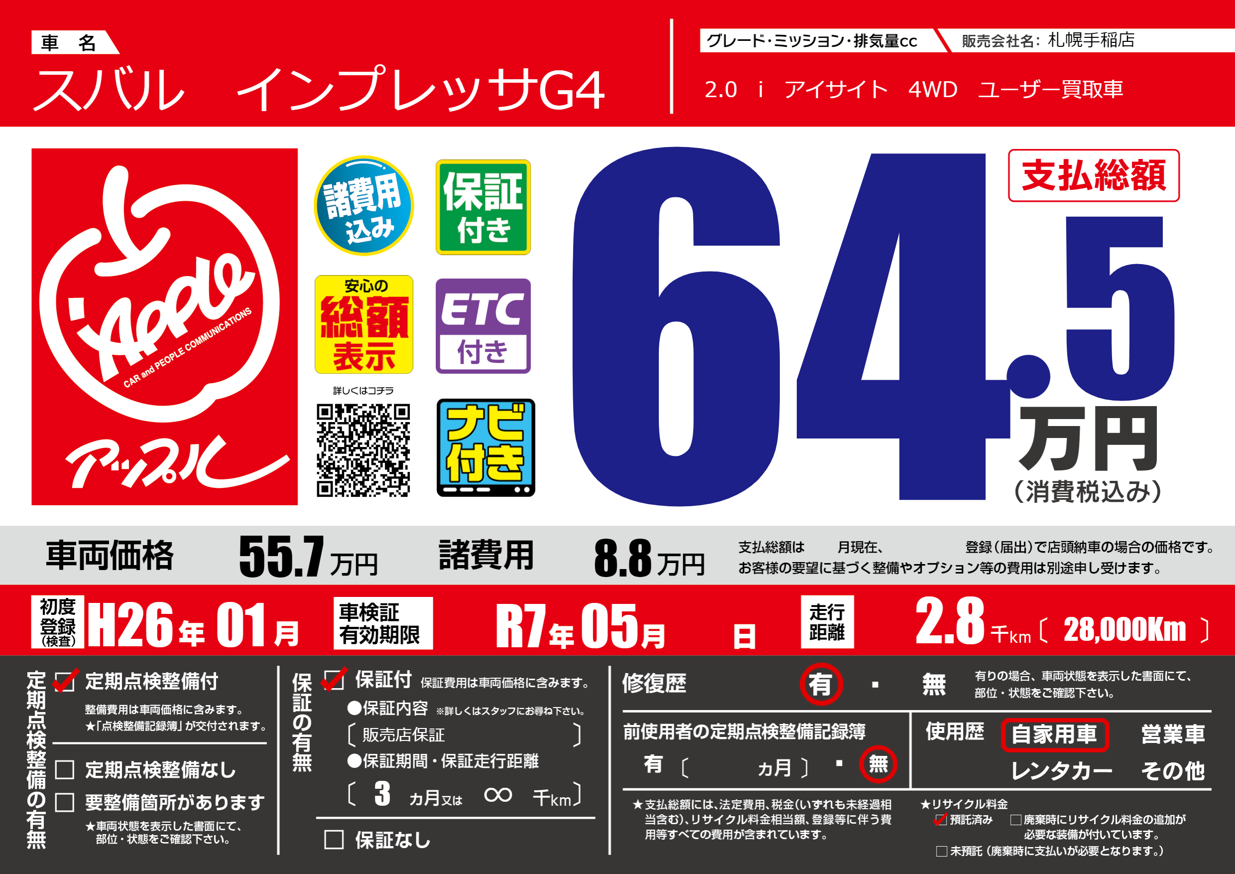 | 車名 | スバル インプレッサG4 | グレード ミッション 排気量 |