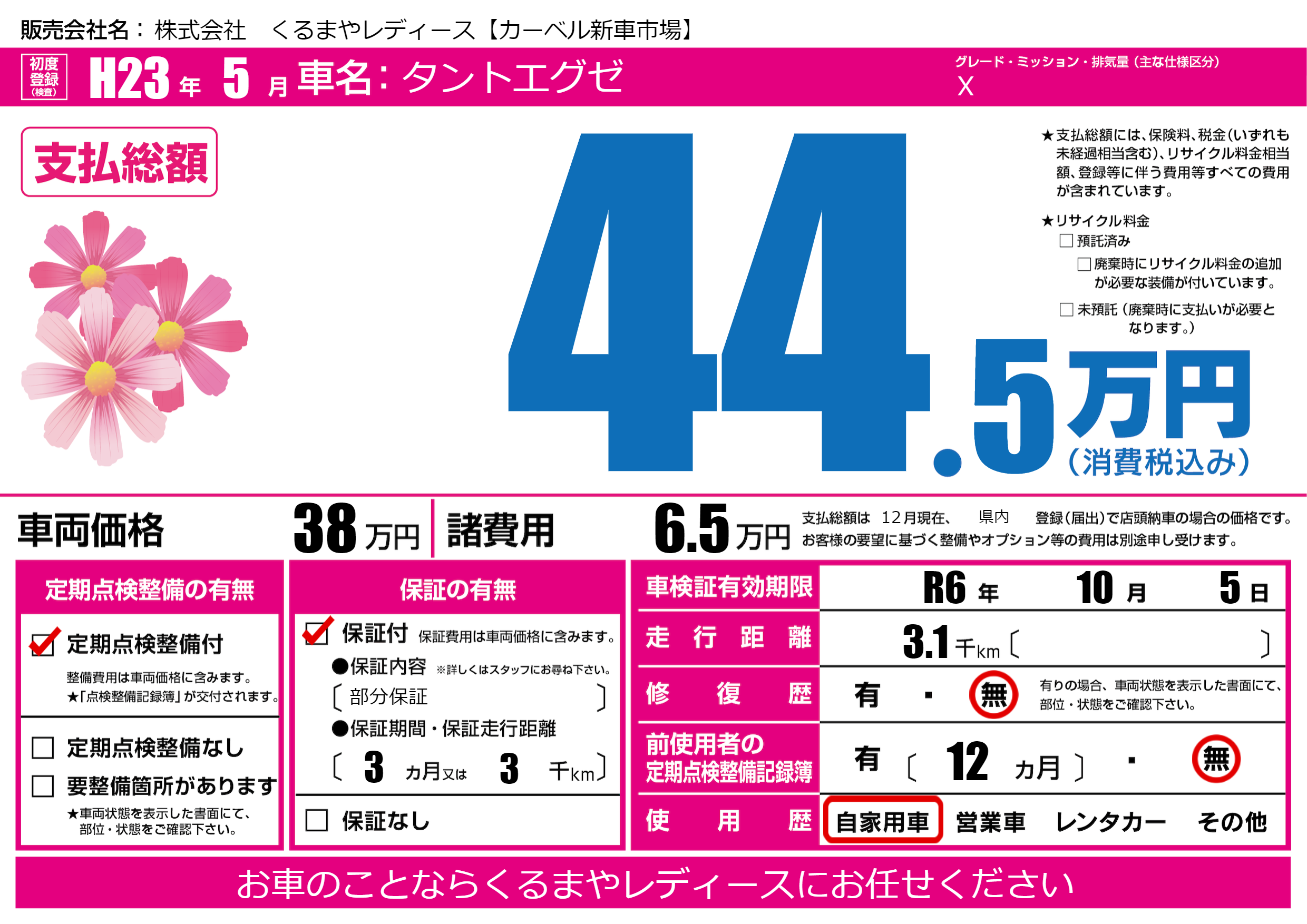 | 車名 | タントエグゼ | グレード ミッション 排気量 |