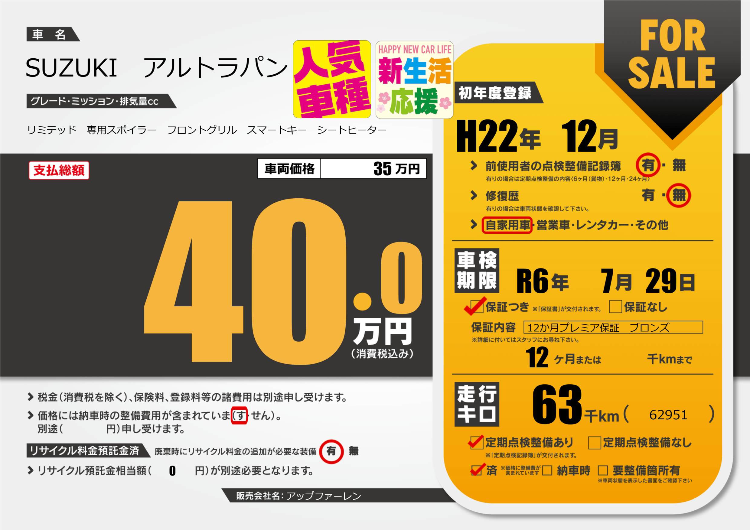 | 車名 | SUZUKI アルトラパン | グレード ミッション 排気量 |