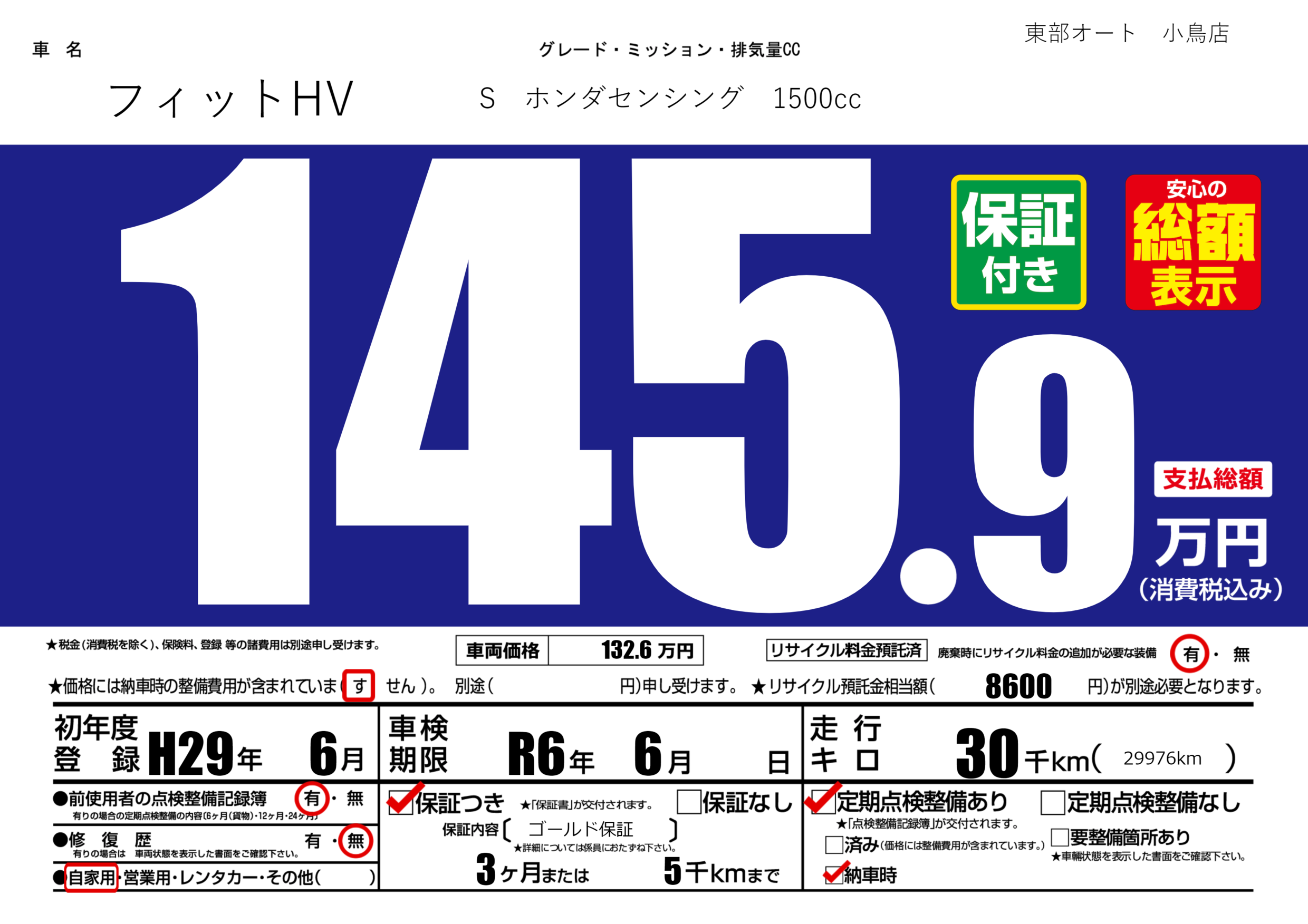 | 走行キロ | 3万km | 初年度登録 | H29年6月 |