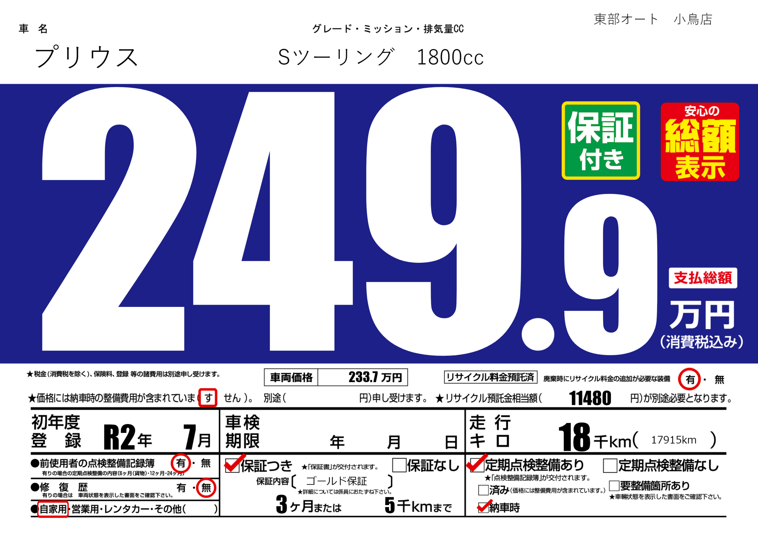 | 車名 | プリウス | グレード ミッション 排気量 |