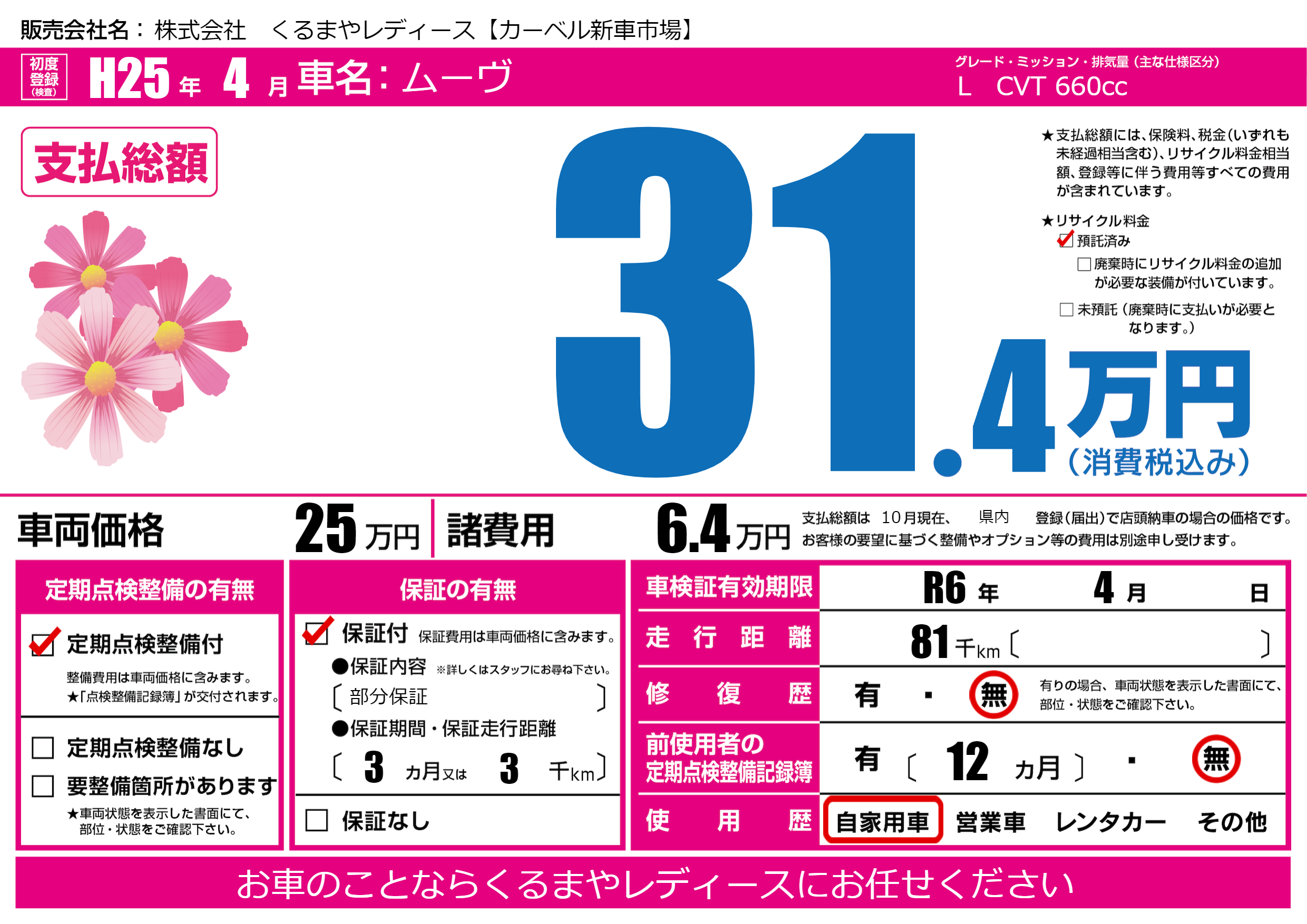 | 車名 | ムーヴ | グレード ミッション 排気量 |
