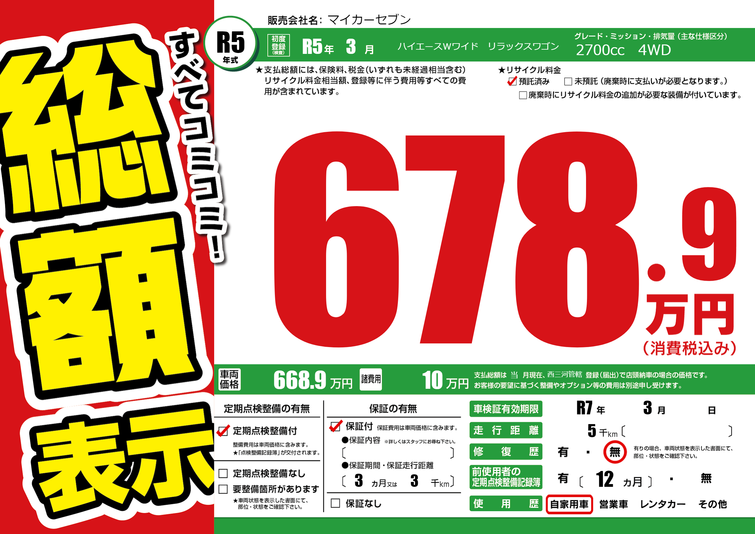 | 走行キロ | 0.5万km | 初年度登録 | R5年3月 |