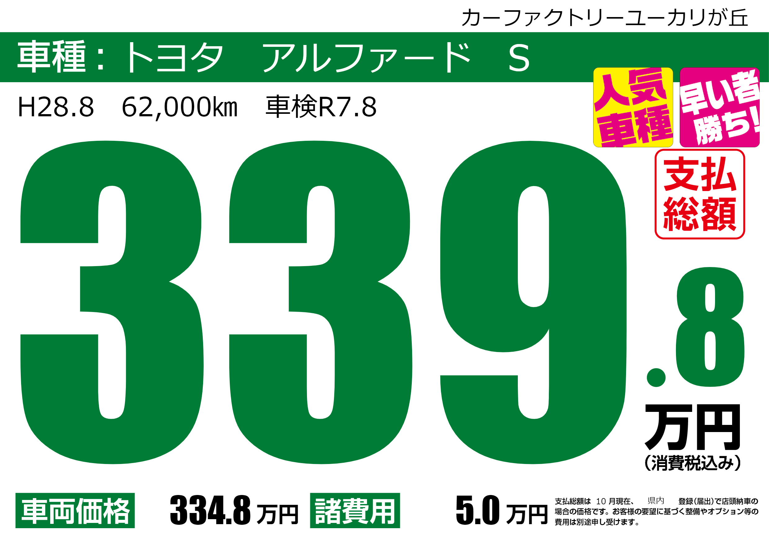 | 車名 | トヨタ アルファード S | グレード ミッション 排気量 |