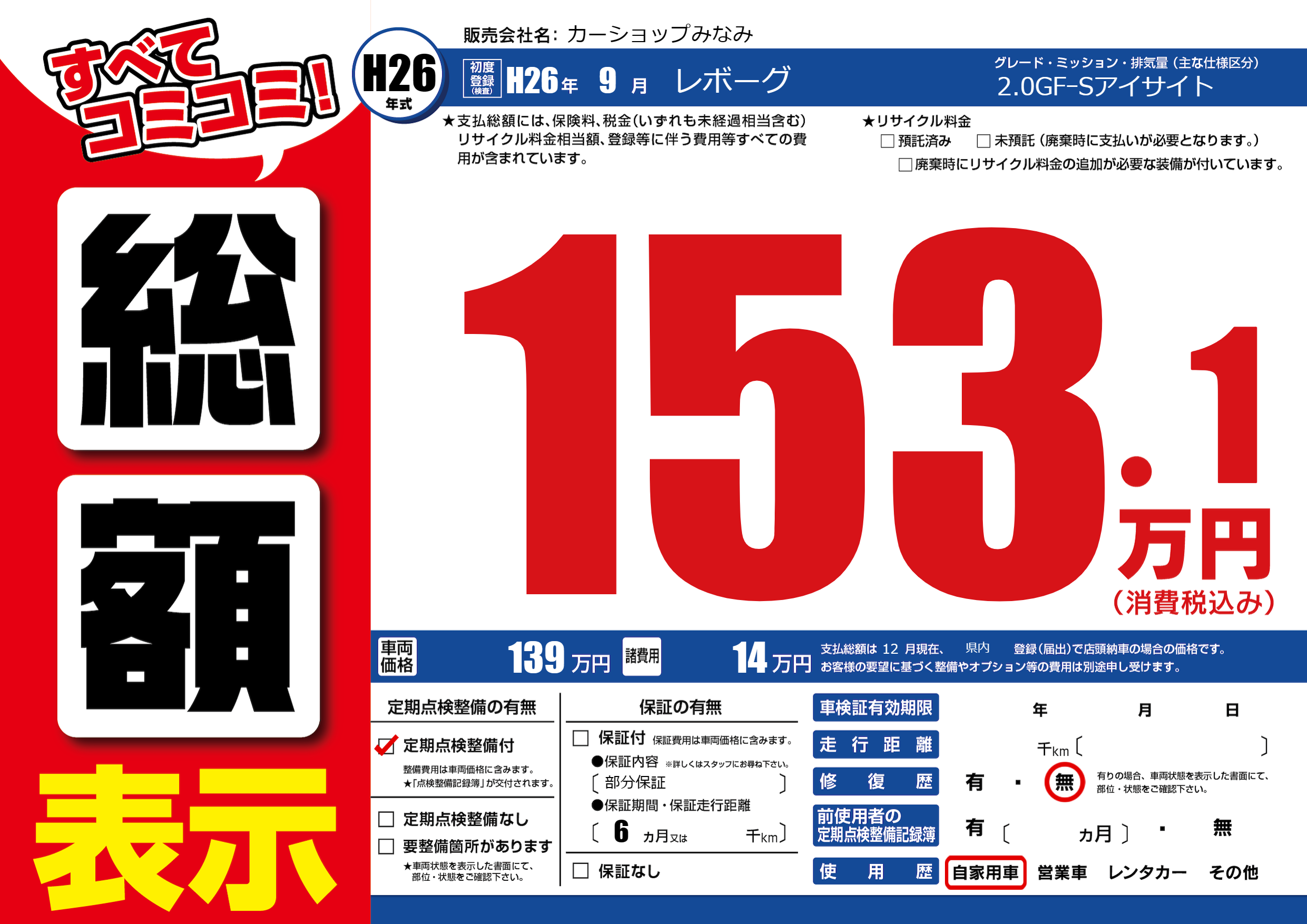 | 車名 | レボーグ | グレード ミッション 排気量 |
