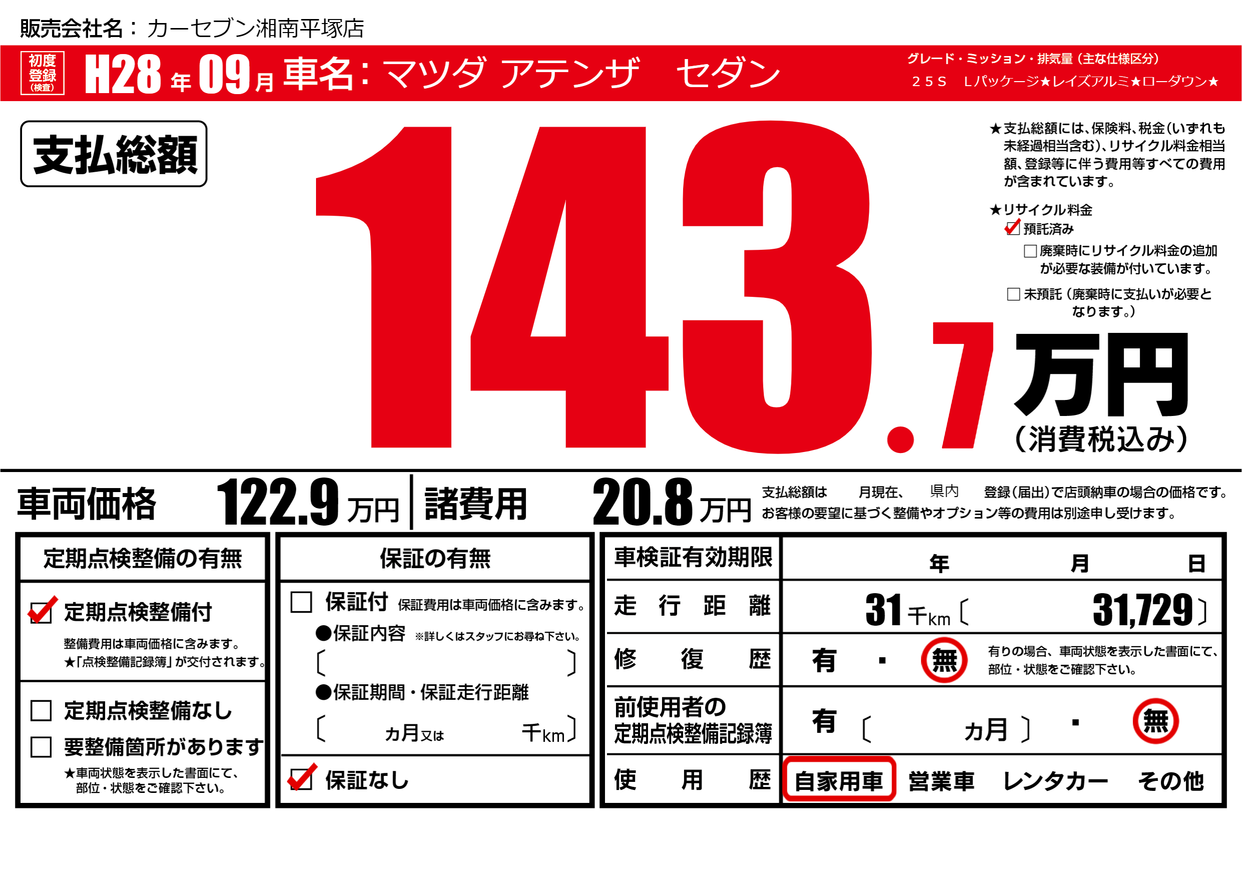 | 走行キロ | 3.1万km | 初年度登録 | H28年09月 |