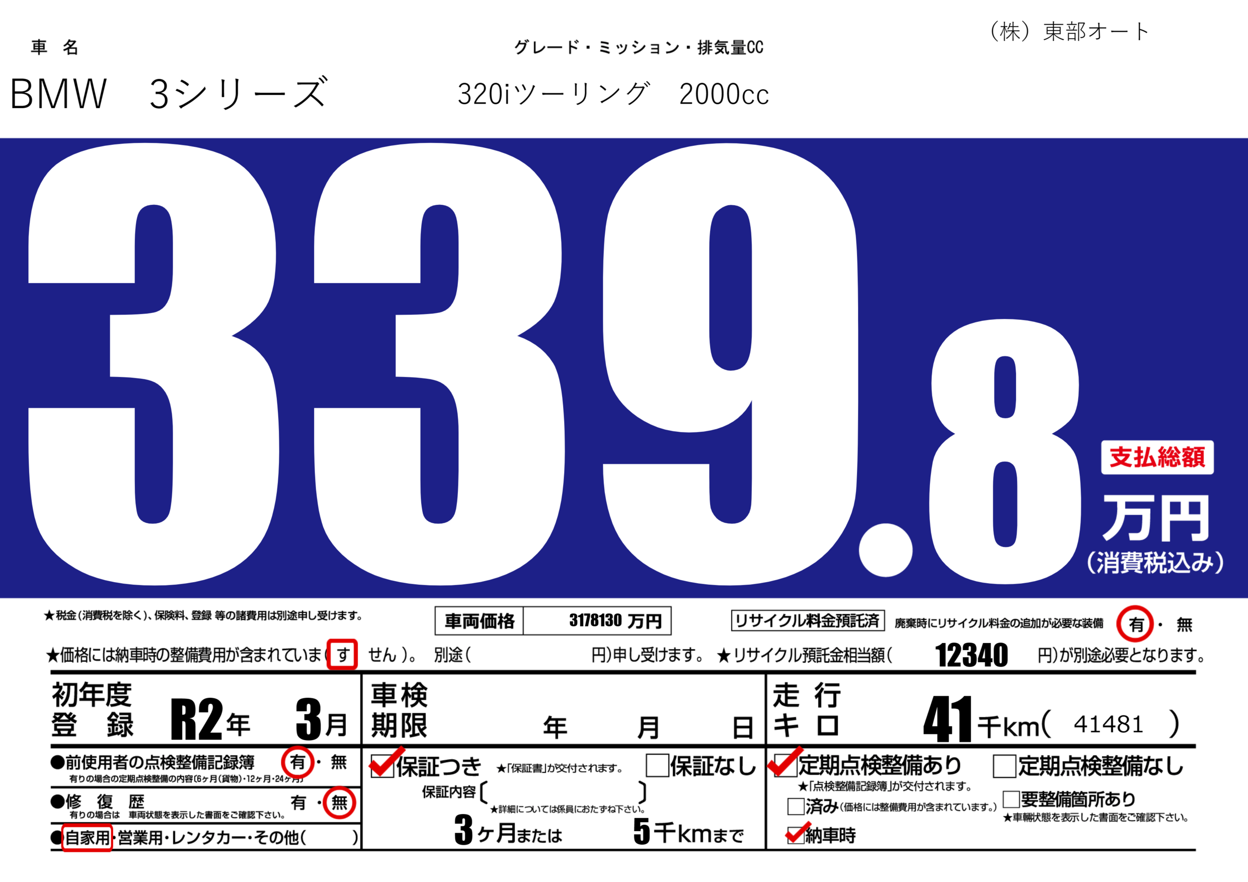 | 車名 | BMW 3シリーズ | グレード ミッション 排気量 |