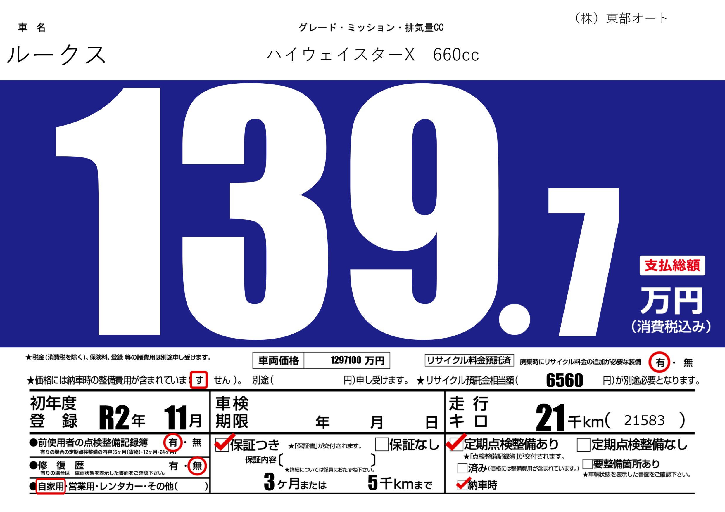 | 定期点検整備 | 定期点検整備あり 納車時あり | ||