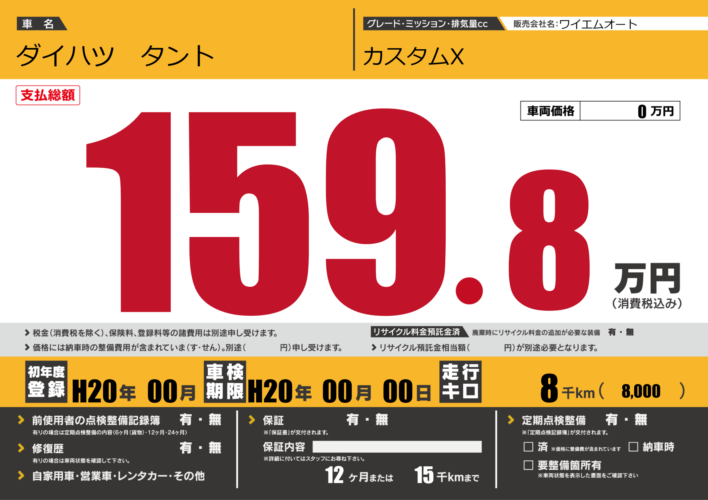 | 車名 | ダイハツ タント | グレード ミッション 排気量 |