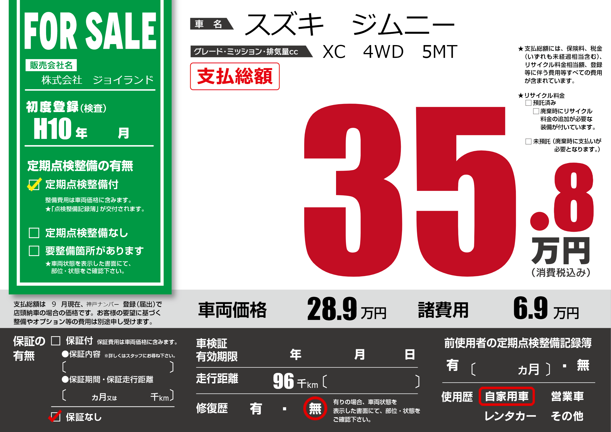 | 車名 | スズキ ジムニー | グレード ミッション 排気量 |