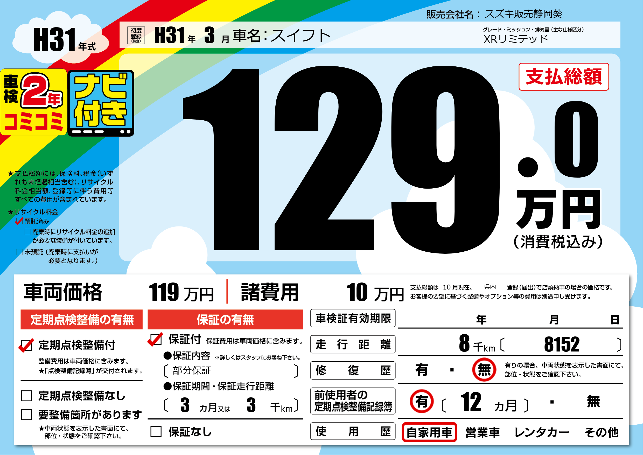 | 走行キロ | 0.8万km | 初年度登録 | H31年3月 |