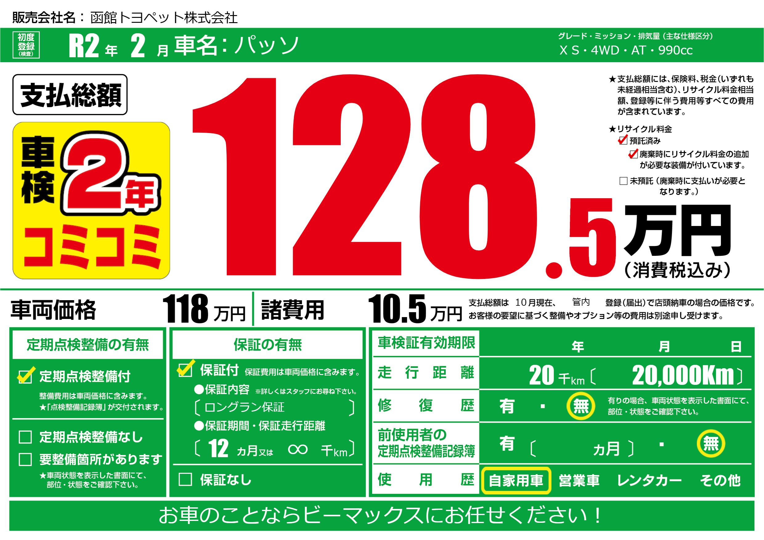 | 車名 | パッソ | グレード ミッション 排気量 |