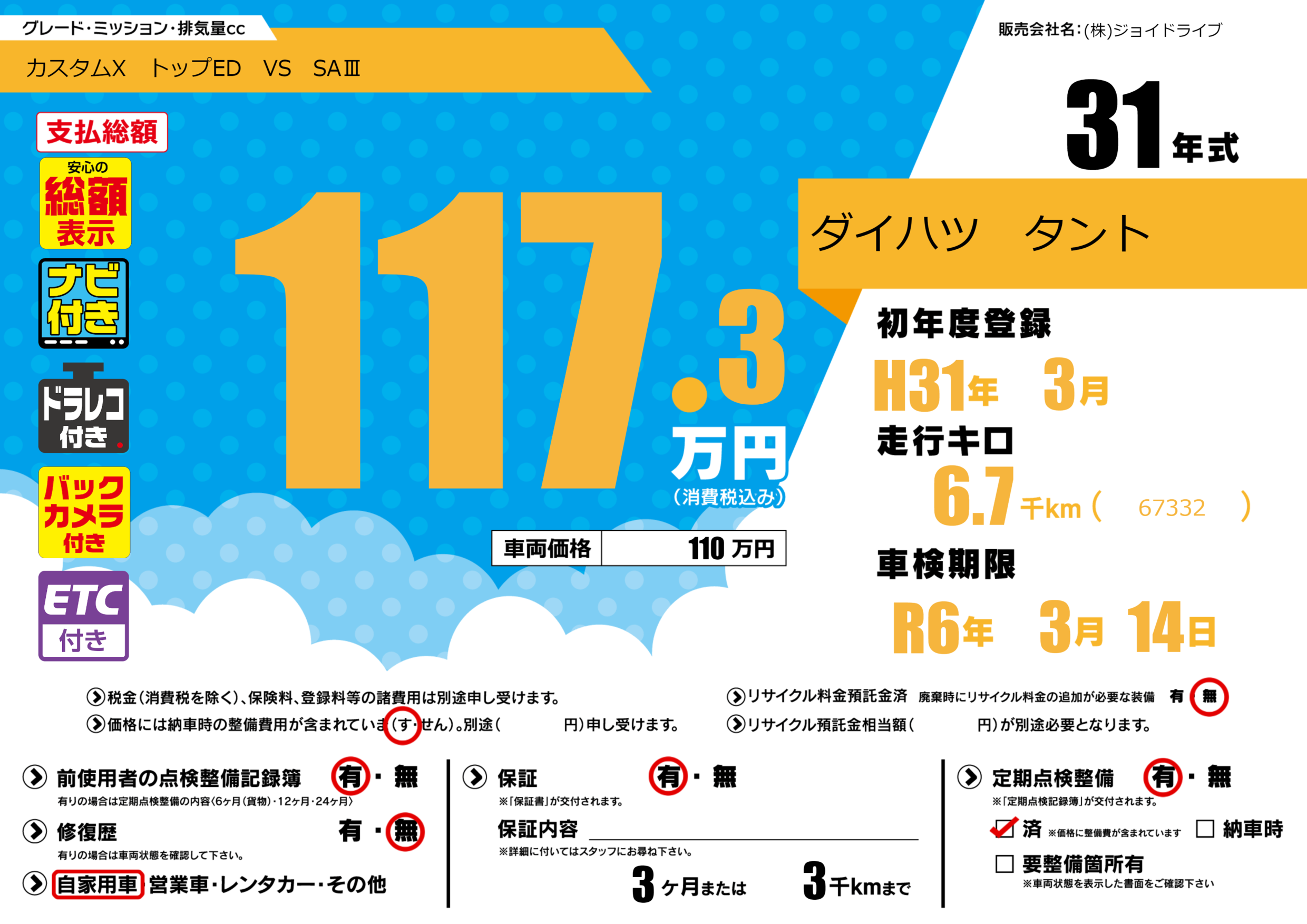 | 定期点検整備 | 定期点検整備あり 定期点検整備済み | ||