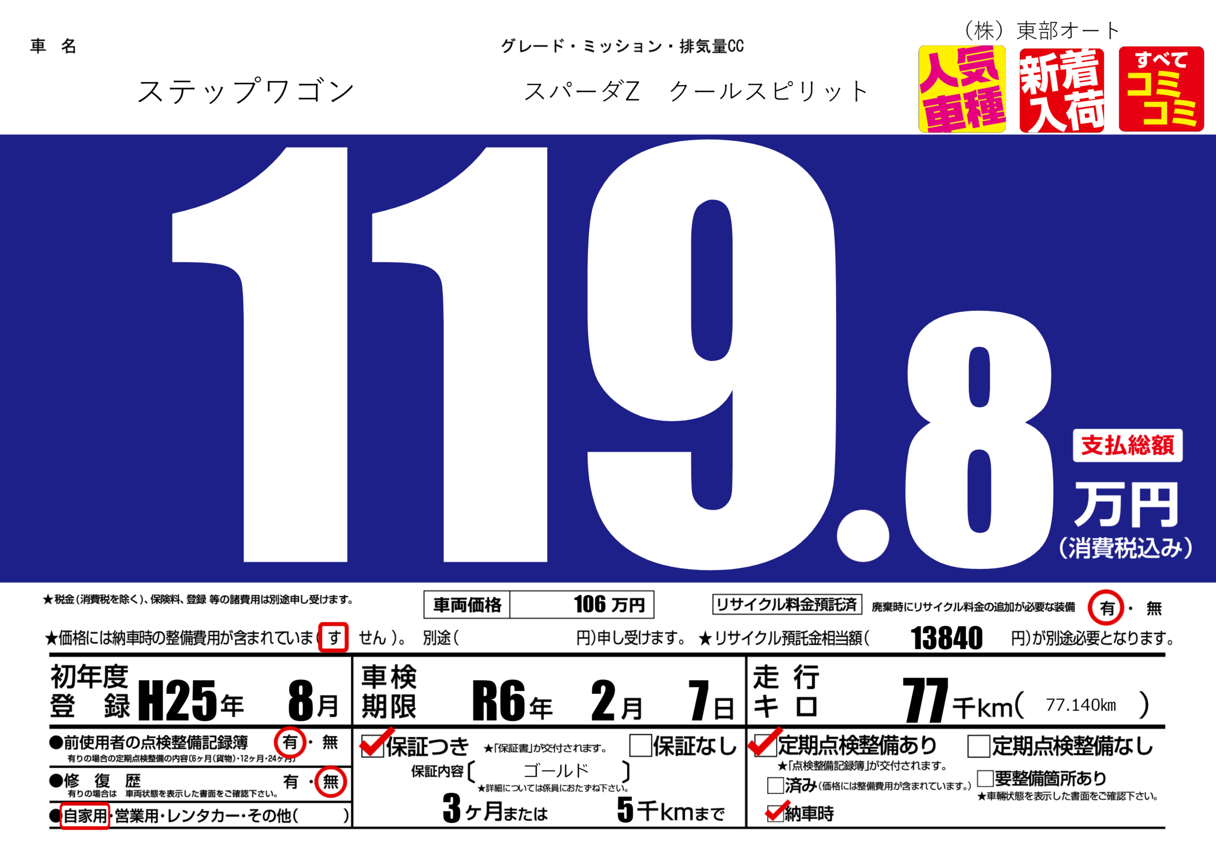 | 走行キロ | 7.7万km | 初年度登録 | H25年8月 |